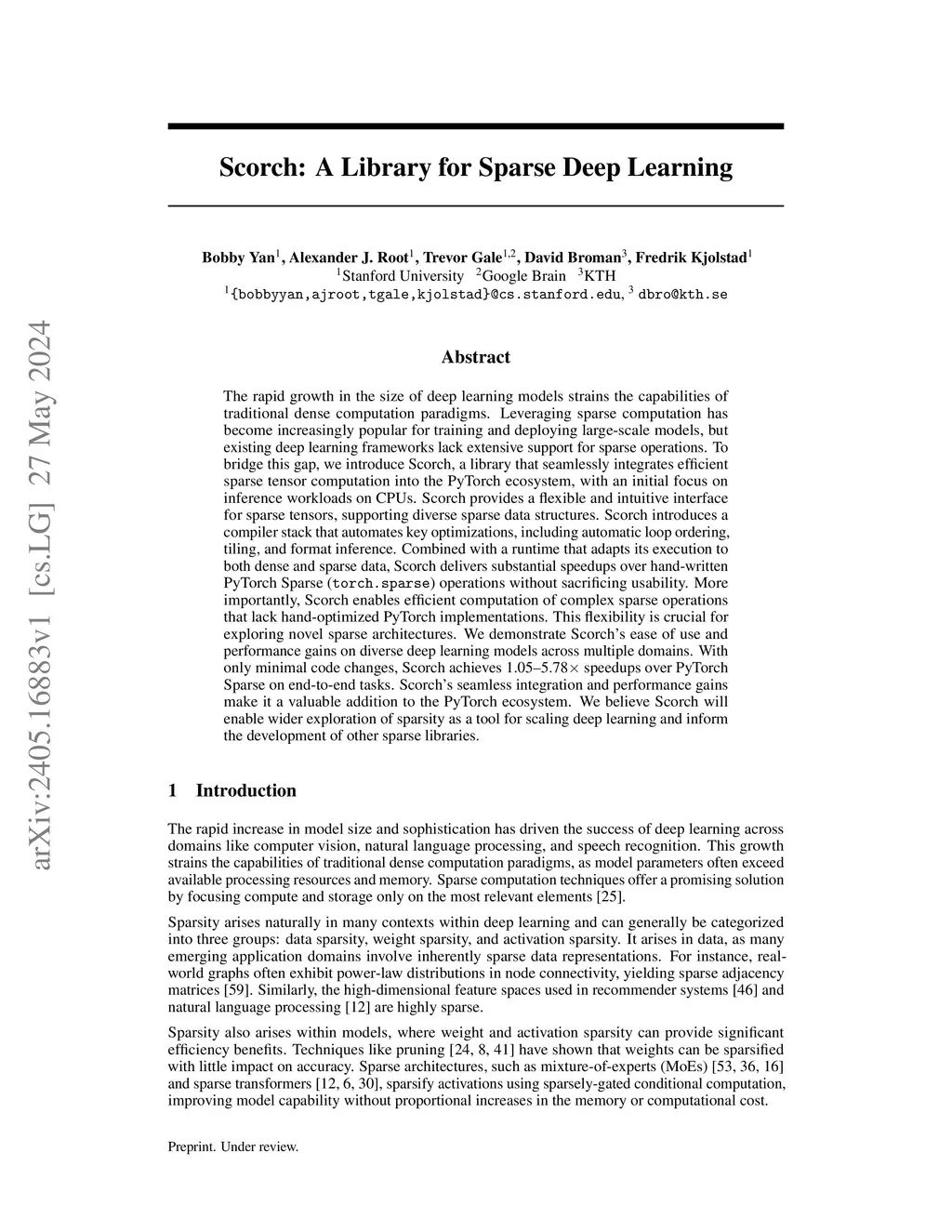 The rapid growth in the size of deep learning models strains the capabilities of traditional dense computation paradigms. Leveraging sparse computation has become increasingly popular for training and deploying large-scale models, but existing deep learning frameworks lack extensive support for sparse operations. To bridge this gap, we introduce Scorch, a library that seamlessly integrates efficient sparse tensor computation into the PyTorch ecosystem, with an initial focus on inference workloads on CPUs. Scorch provides a flexible and intuitive interface for sparse tensors, supporting diverse sparse data structures. Scorch introduces a compiler stack that automates key optimizations, including automatic loop ordering, tiling, and format inference. Combined with a runtime that adapts its execution to both dense and sparse data, Scorch delivers substantial speedups over hand-written PyTorch Sparse (torch.sparse) operations without sacrificing usability. More importantly, Scorch enables efficient computation of complex sparse operations that lack hand-optimized PyTorch implementations. This flexibility is crucial for exploring novel sparse architectures. We demonstrate Scorch's ease of use and performance gains on diverse deep learning models across multiple domains. With only minimal code changes, Scorch achieves 1.05-5.78x speedups over PyTorch Sparse on end-to-end tasks. Scorch's seamless integration and performance gains make it a valuable addition to the PyTorch ecosystem. We believe Scorch will enable wider exploration of sparsity as a tool for scaling deep learning and inform the development of other sparse libraries.