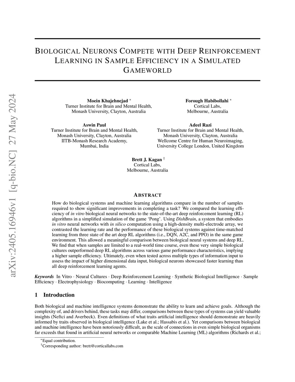 Biological Neurons Compete with Deep Reinforcement Learning in Sample