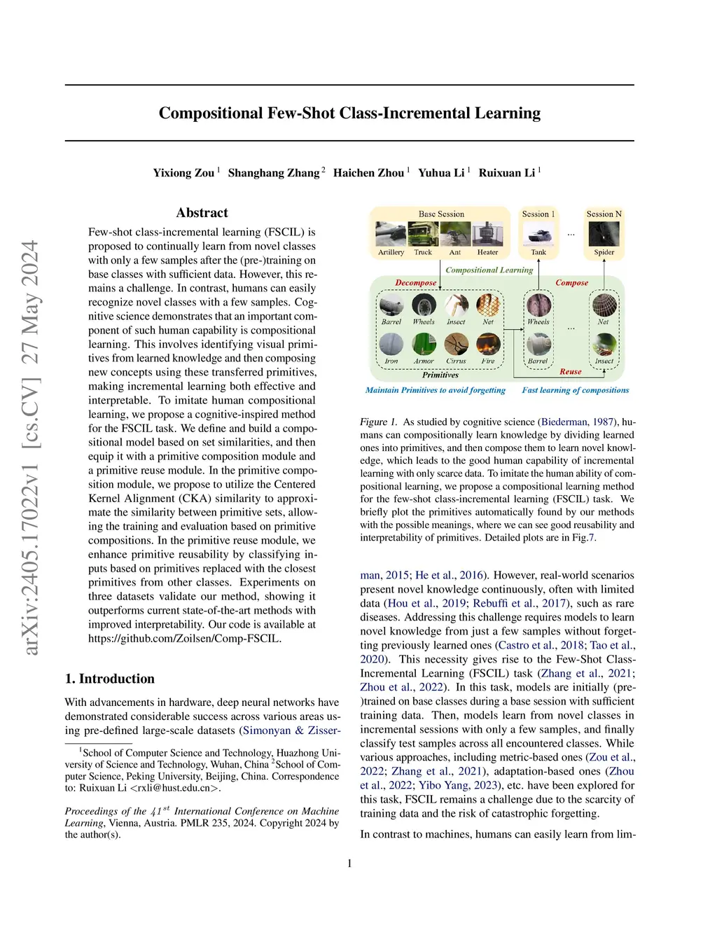 Few-shot class-incremental learning (FSCIL) is proposed to continually learn from novel classes with only a few samples after the (pre-)training on base classes with sufficient data. However, this remains a challenge. In contrast, humans can easily recognize novel classes with a few samples. Cognitive science demonstrates that an important component of such human capability is compositional learning. This involves identifying visual primitives from learned knowledge and then composing new concepts using these transferred primitives, making incremental learning both effective and interpretable. To imitate human compositional learning, we propose a cognitive-inspired method for the FSCIL task. We define and build a compositional model based on set similarities, and then equip it with a primitive composition module and a primitive reuse module. In the primitive composition module, we propose to utilize the Centered Kernel Alignment (CKA) similarity to approximate the similarity between primitive sets, allowing the training and evaluation based on primitive compositions. In the primitive reuse module, we enhance primitive reusability by classifying inputs based on primitives replaced with the closest primitives from other classes. Experiments on three datasets validate our method, showing it outperforms current state-of-the-art methods with improved interpretability. Our code is available at https://github.com/Zoilsen/Comp-FSCIL.