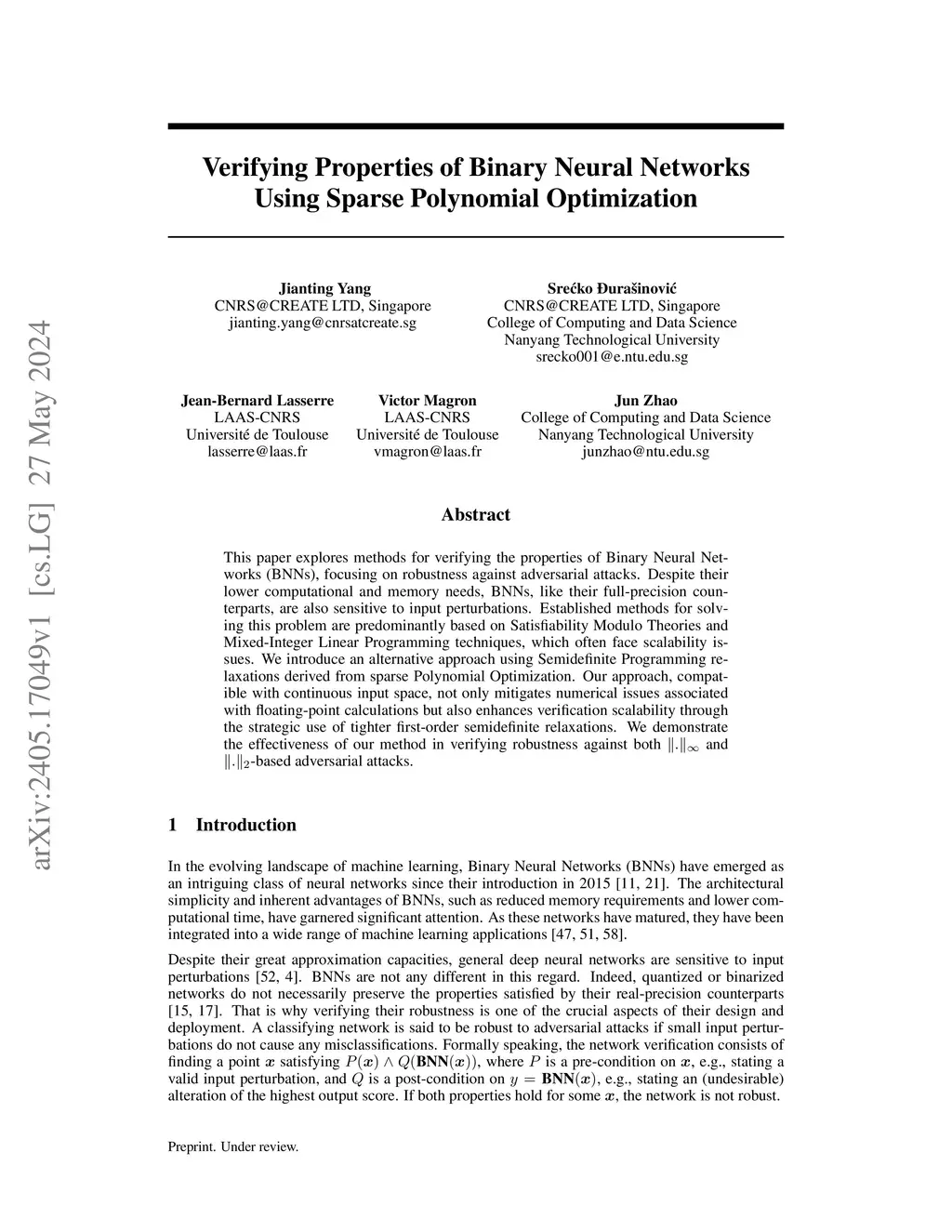 This paper explores methods for verifying the properties of Binary Neural Networks (BNNs), focusing on robustness against adversarial attacks. Despite their lower computational and memory needs, BNNs, like their full-precision counterparts, are also sensitive to input perturbations. Established methods for solving this problem are predominantly based on Satisfiability Modulo Theories and Mixed-Integer Linear Programming techniques, which are characterized by NP complexity and often face scalability issues.We introduce an alternative approach using Semidefinite Programming relaxations derived from sparse Polynomial Optimization. Our approach, compatible with continuous input space, not only mitigates numerical issues associated with floating-point calculations but also enhances verification scalability through the strategic use of tighter first-order semidefinite relaxations. We demonstrate the effectiveness of our method in verifying robustness against both and -based adversarial attacks.