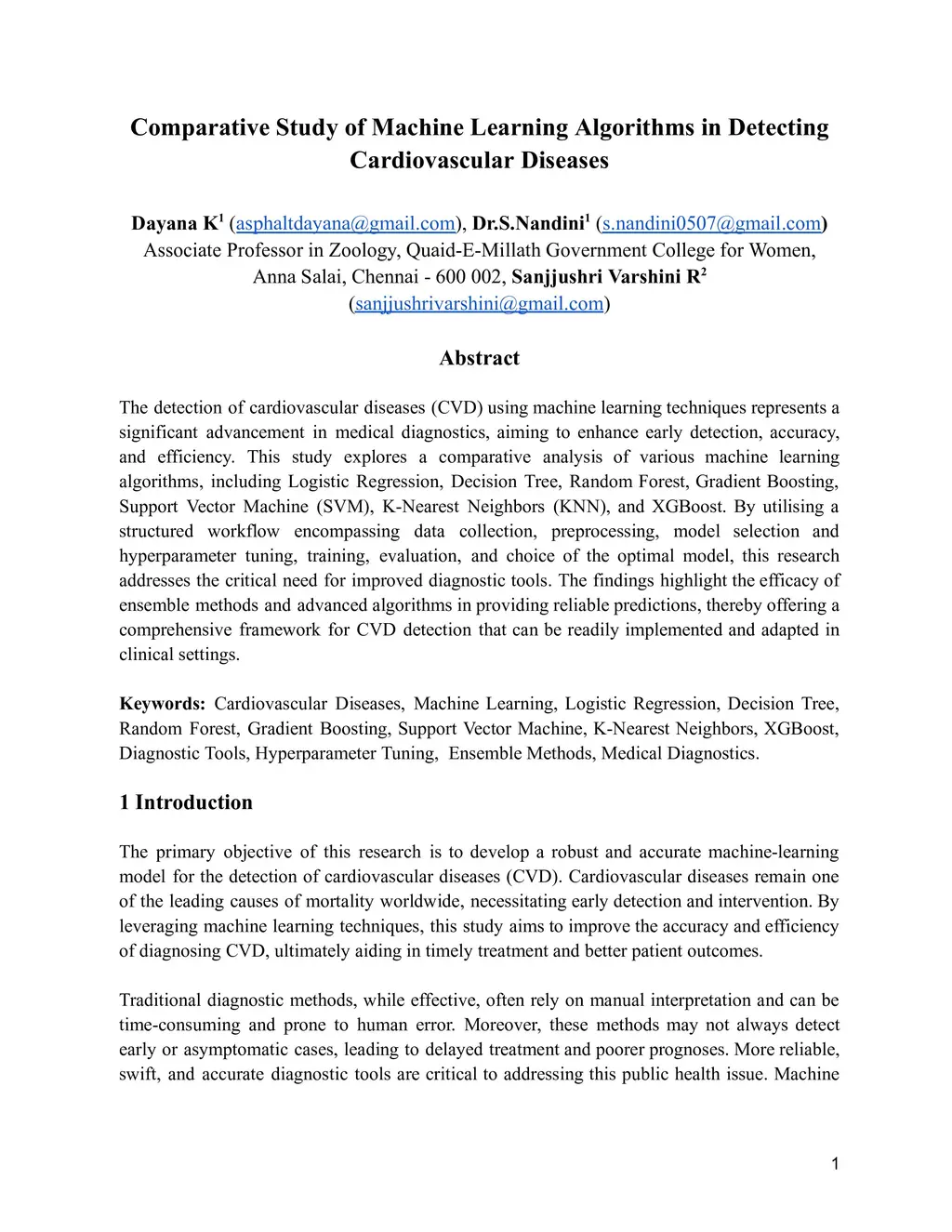 The detection of cardiovascular diseases (CVD) using machine learning techniques represents a significant advancement in medical diagnostics, aiming to enhance early detection, accuracy, and efficiency. This study explores a comparative analysis of various machine learning algorithms, including Logistic Regression, Decision Tree, Random Forest, Gradient Boosting, Support Vector Machine (SVM), K-Nearest Neighbors (KNN), and XGBoost. By utilising a structured workflow encompassing data collection, preprocessing, model selection and hyperparameter tuning, training, evaluation, and choice of the optimal model, this research addresses the critical need for improved diagnostic tools. The findings highlight the efficacy of ensemble methods and advanced algorithms in providing reliable predictions, thereby offering a comprehensive framework for CVD detection that can be readily implemented and adapted in clinical settings.