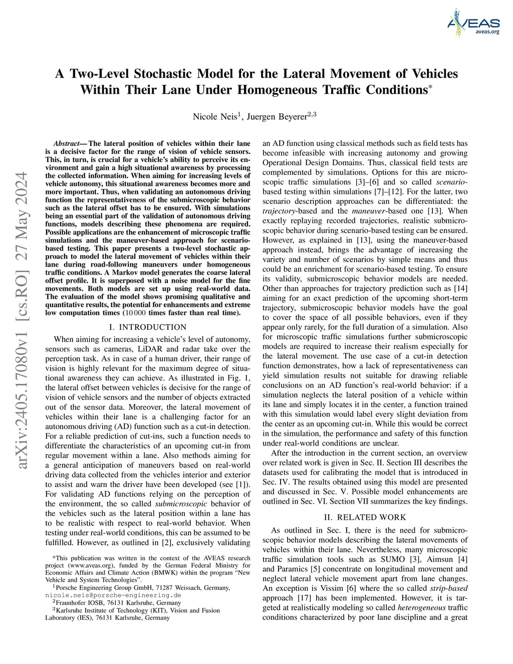The lateral position of vehicles within their lane is a decisive factor for the range of vision of vehicle sensors. This, in turn, is crucial for a vehicle's ability to perceive its environment and gain a high situational awareness by processing the collected information. When aiming for increasing levels of vehicle autonomy, this situational awareness becomes more and more important. Thus, when validating an autonomous driving function the representativeness of the submicroscopic behavior such as the lateral offset has to be ensured. With simulations being an essential part of the validation of autonomous driving functions, models describing these phenomena are required. Possible applications are the enhancement of microscopic traffic simulations and the maneuver-based approach for scenario-based testing. This paper presents a two-level stochastic approach to model the lateral movement of vehicles within their lane during road-following maneuvers under homogeneous traffic conditions. A Markov model generates the coarse lateral offset profile. It is superposed with a noise model for the fine movements. Both models are set up using real-world data. The evaluation of the model shows promising qualitative and quantitative results, the potential for enhancements and extreme low computation times (10000 times faster than real time).