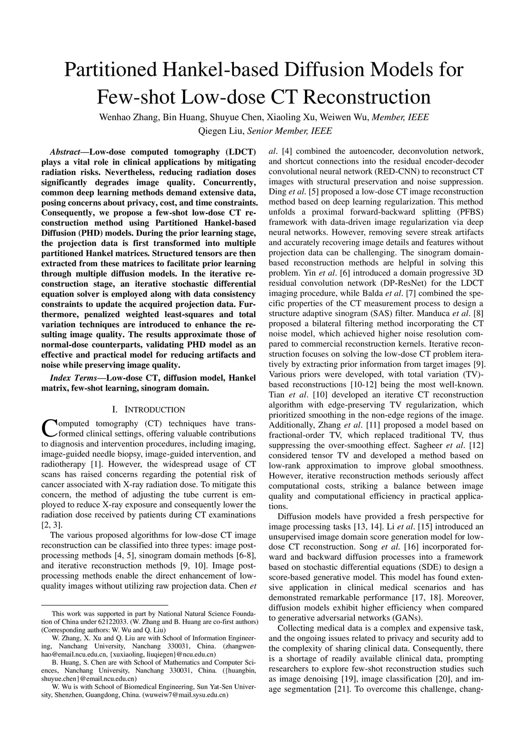 Low-dose computed tomography (LDCT) plays a vital role in clinical applications by mitigating radiation risks. Nevertheless, reducing radiation doses significantly degrades image quality. Concurrently, common deep learning methods demand extensive data, posing concerns about privacy, cost, and time constraints. Consequently, we propose a few-shot low-dose CT reconstruction method using Partitioned Hankel-based Diffusion (PHD) models. During the prior learning stage, the projection data is first transformed into multiple partitioned Hankel matrices. Structured tensors are then extracted from these matrices to facilitate prior learning through multiple diffusion models. In the iterative reconstruction stage, an iterative stochastic differential equation solver is employed along with data consistency constraints to update the acquired projection data. Furthermore, penalized weighted least-squares and total variation techniques are introduced to enhance the resulting image quality. The results approximate those of normal-dose counterparts, validating PHD model as an effective and practical model for reducing artifacts and noise while preserving image quality.