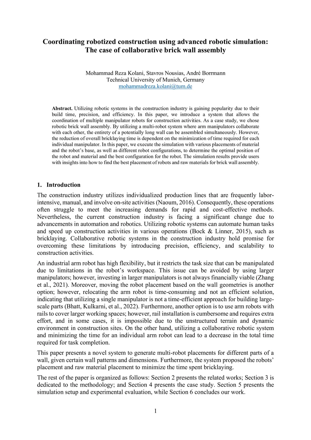Utilizing robotic systems in the construction industry is gaining popularity due to their build time, precision, and efficiency. In this paper, we introduce a system that allows the coordination of multiple manipulator robots for construction activities. As a case study, we chose robotic brick wall assembly. By utilizing a multi robot system where arm manipulators collaborate with each other, the entirety of a potentially long wall can be assembled simultaneously. However, the reduction of overall bricklaying time is dependent on the minimization of time required for each individual manipulator. In this paper, we execute the simulation with various placements of material and the robots base, as well as different robot configurations, to determine the optimal position of the robot and material and the best configuration for the robot. The simulation results provide users with insights into how to find the best placement of robots and raw materials for brick wall assembly.