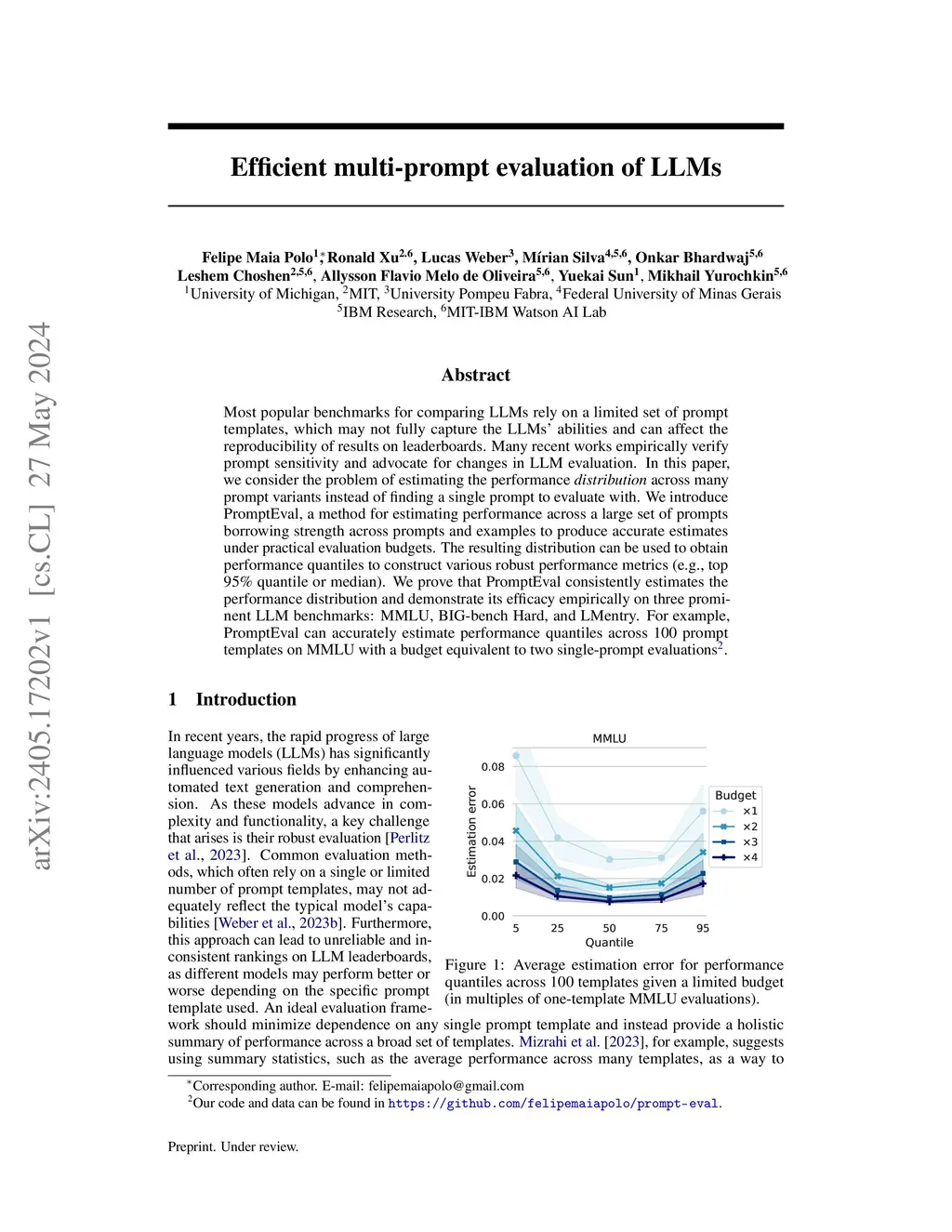 Most popular benchmarks for comparing LLMs rely on a limited set of prompt templates, which may not fully capture the LLMs' abilities and can affect the reproducibility of results on leaderboards. Many recent works empirically verify prompt sensitivity and advocate for changes in LLM evaluation. In this paper, we consider the problem of estimating the performance distribution across many prompt variants instead of finding a single prompt to evaluate with. We introduce PromptEval, a method for estimating performance across a large set of prompts borrowing strength across prompts and examples to produce accurate estimates under practical evaluation budgets. The resulting distribution can be used to obtain performance quantiles to construct various robust performance metrics (e.g., top 95% quantile or median). We prove that PromptEval consistently estimates the performance distribution and demonstrate its efficacy empirically on three prominent LLM benchmarks: MMLU, BIG-bench Hard, and LMentry. For example, PromptEval can accurately estimate performance quantiles across 100 prompt templates on MMLU with a budget equivalent to two single-prompt evaluations. Our code and data can be found at https://github.com/felipemaiapolo/prompt-eval.