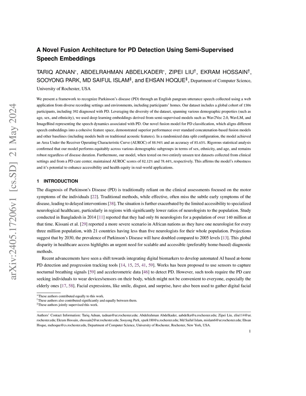 We present a framework to recognize Parkinson's disease (PD) through an English pangram utterance speech collected using a web application from diverse recording settings and environments, including participants' homes. Our dataset includes a global cohort of 1306 participants, including 392 diagnosed with PD. Leveraging the diversity of the dataset, spanning various demographic properties (such as age, sex, and ethnicity), we used deep learning embeddings derived from semi-supervised models such as Wav2Vec 2.0, WavLM, and ImageBind representing the speech dynamics associated with PD. Our novel fusion model for PD classification, which aligns different speech embeddings into a cohesive feature space, demonstrated superior performance over standard concatenation-based fusion models and other baselines (including models built on traditional acoustic features). In a randomized data split configuration, the model achieved an Area Under the Receiver Operating Characteristic Curve (AUROC) of 88.94% and an accuracy of 85.65%. Rigorous statistical analysis confirmed that our model performs equitably across various demographic subgroups in terms of sex, ethnicity, and age, and remains robust regardless of disease duration. Furthermore, our model, when tested on two entirely unseen test datasets collected from clinical settings and from a PD care center, maintained AUROC scores of 82.12% and 78.44%, respectively. This affirms the model's robustness and it's potential to enhance accessibility and health equity in real-world applications.