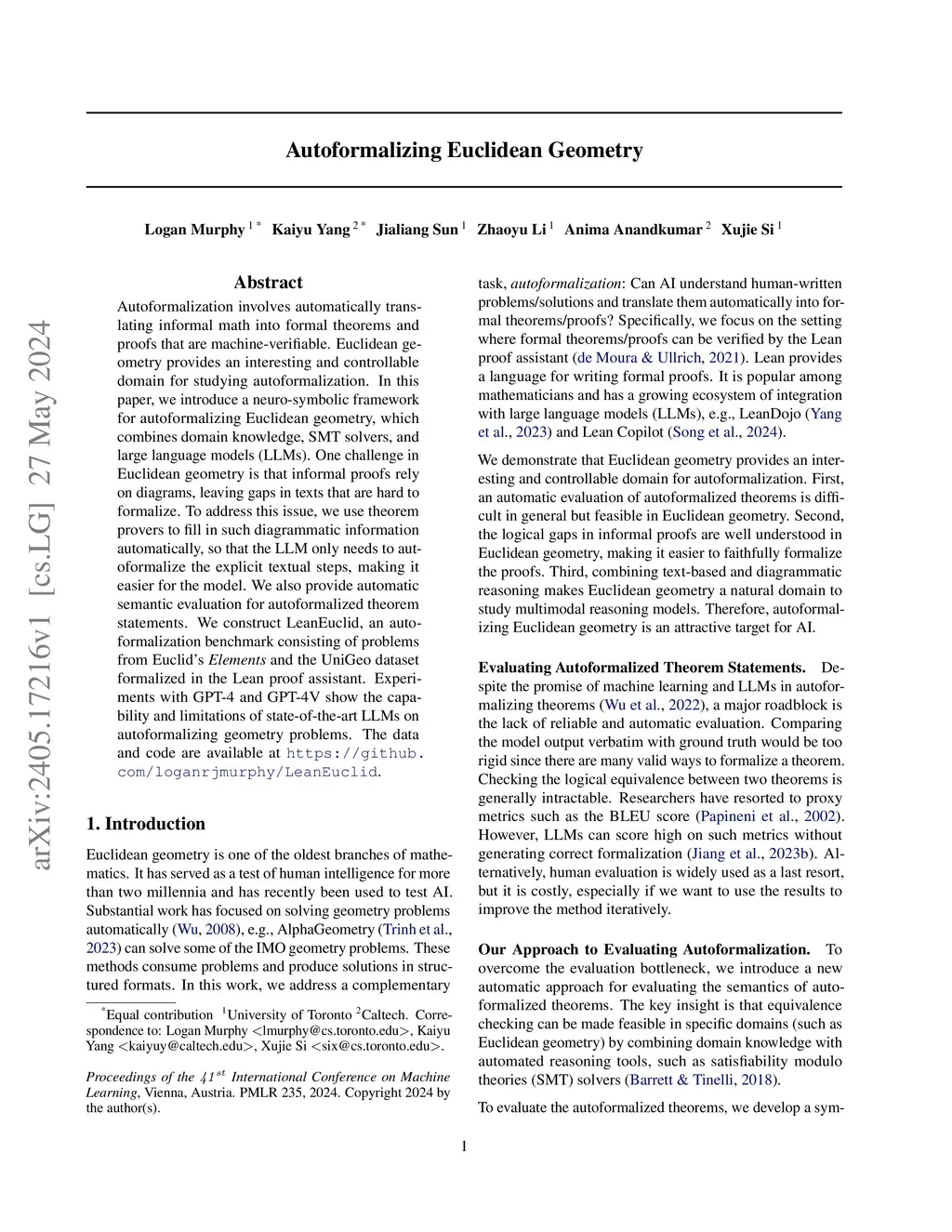 Autoformalization involves automatically translating informal math into formal theorems and proofs that are machine-verifiable. Euclidean geometry provides an interesting and controllable domain for studying autoformalization. In this paper, we introduce a neuro-symbolic framework for autoformalizing Euclidean geometry, which combines domain knowledge, SMT solvers, and large language models (LLMs). One challenge in Euclidean geometry is that informal proofs rely on diagrams, leaving gaps in texts that are hard to formalize. To address this issue, we use theorem provers to fill in such diagrammatic information automatically, so that the LLM only needs to autoformalize the explicit textual steps, making it easier for the model. We also provide automatic semantic evaluation for autoformalized theorem statements. We construct LeanEuclid, an autoformalization benchmark consisting of problems from Euclid's Elements and the UniGeo dataset formalized in the Lean proof assistant. Experiments with GPT-4 and GPT-4V show the capability and limitations of state-of-the-art LLMs on autoformalizing geometry problems. The data and code are available at https://github.com/loganrjmurphy/LeanEuclid.