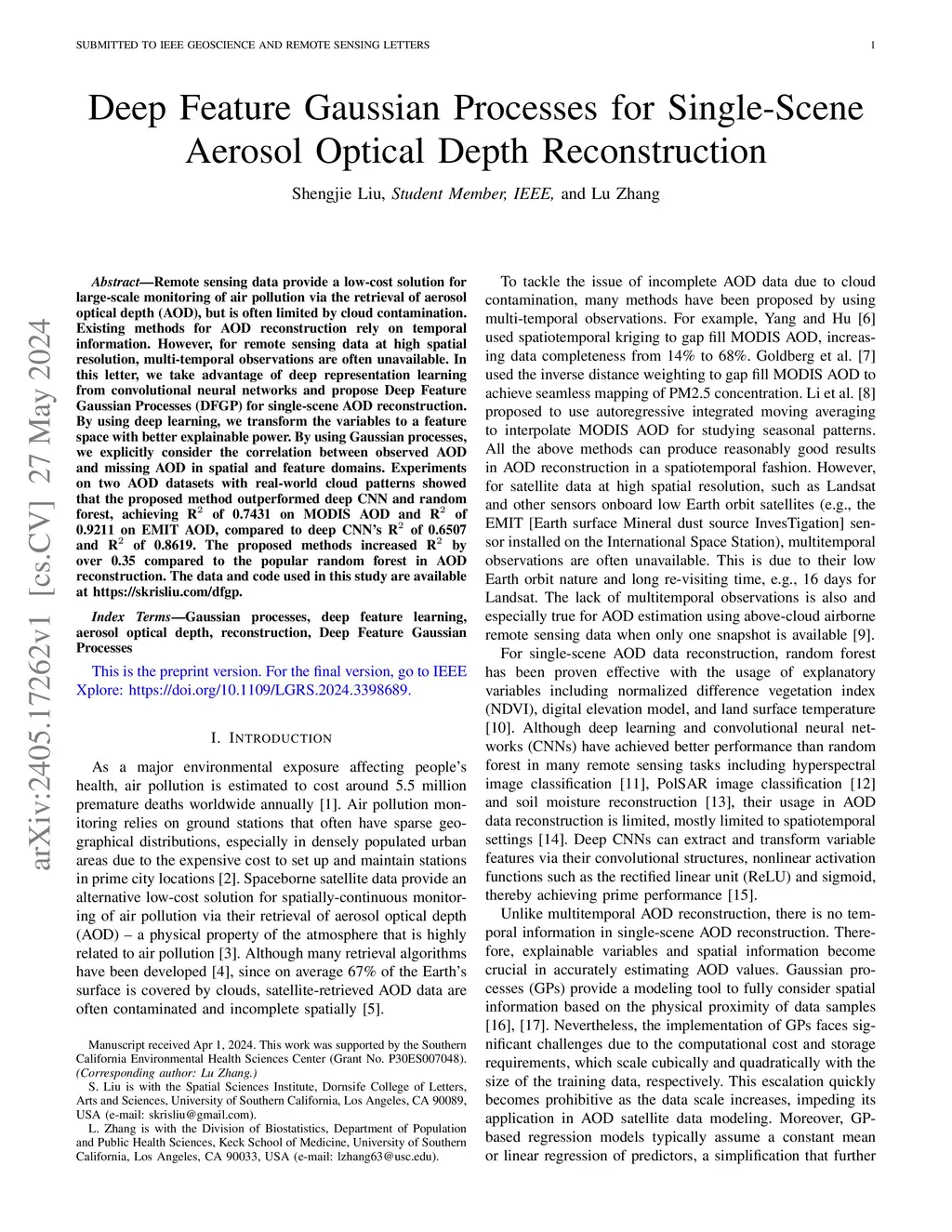 Remote sensing data provide a low-cost solution for large-scale monitoring of air pollution via the retrieval of aerosol optical depth (AOD), but is often limited by cloud contamination. Existing methods for AOD reconstruction rely on temporal information. However, for remote sensing data at high spatial resolution, multi-temporal observations are often unavailable. In this letter, we take advantage of deep representation learning from convolutional neural networks and propose Deep Feature Gaussian Processes (DFGP) for single-scene AOD reconstruction. By using deep learning, we transform the variables to a feature space with better explainable power. By using Gaussian processes, we explicitly consider the correlation between observed AOD and missing AOD in spatial and feature domains. Experiments on two AOD datasets with real-world cloud patterns showed that the proposed method outperformed deep CNN and random forest, achieving R of 0.7431 on MODIS AOD and R of 0.9211 on EMIT AOD, compared to deep CNN's R of 0.6507 and R of 0.8619. The proposed methods increased R by over 0.35 compared to the popular random forest in AOD reconstruction. The data and code used in this study are available at \url{https://skrisliu.com/dfgp}.