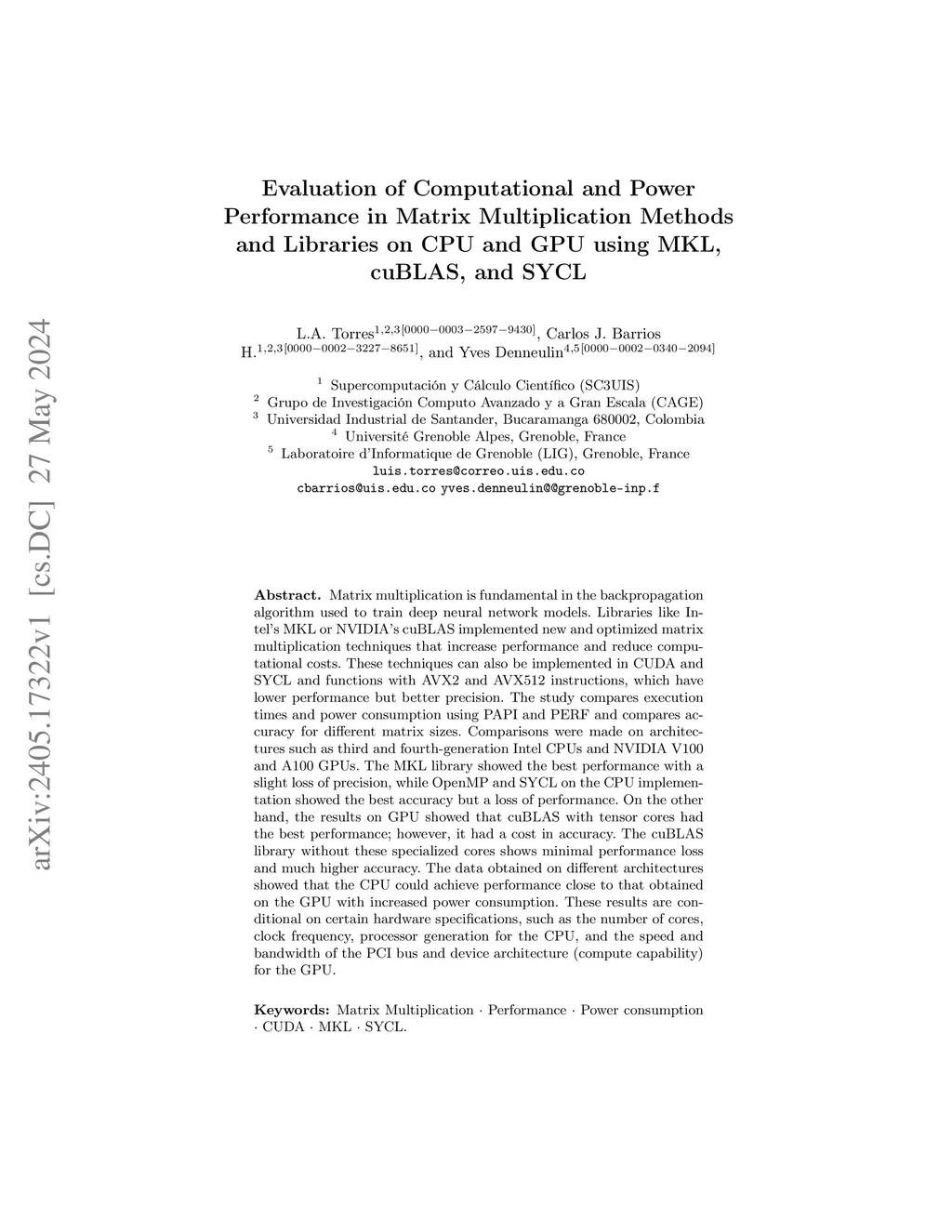 multiplication algorithms on CPU and GPU using MKL, cuBLAS and SYCL