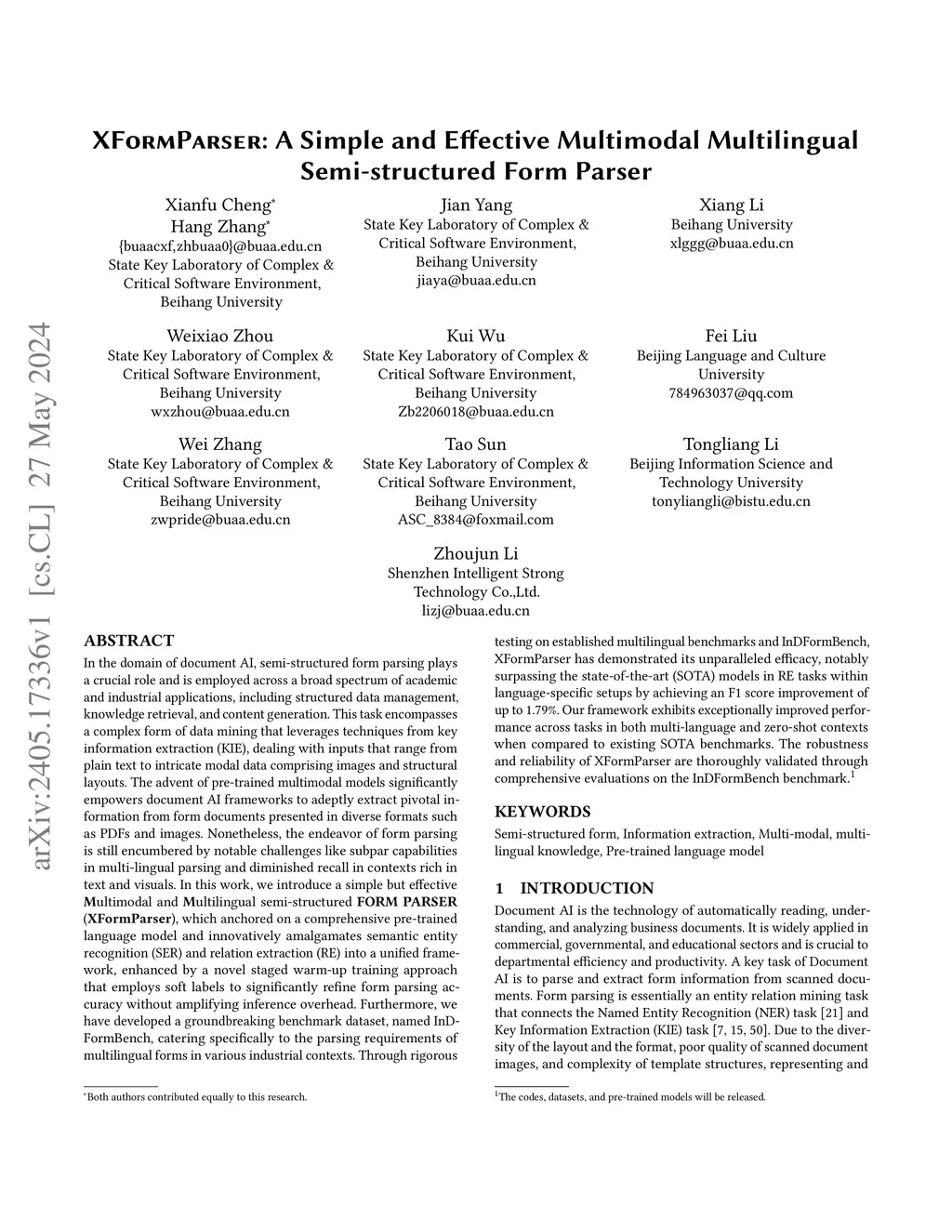 In the domain of document AI, semi-structured form parsing plays a crucial role. This task leverages techniques from key information extraction (KIE), dealing with inputs that range from plain text to intricate modal data comprising images and structural layouts. The advent of pre-trained multimodal models has driven the extraction of key information from form documents in different formats such as PDFs and images. Nonetheless, the endeavor of form parsing is still encumbered by notable challenges like subpar capabilities in multi-lingual parsing and diminished recall in contexts rich in text and visuals. In this work, we introduce a simple but effective \textbf{M}ultimodal and \textbf{M}ultilingual semi-structured \textbf{FORM} \textbf{PARSER} (\textbf{XFormParser}), which is anchored on a comprehensive pre-trained language model and innovatively amalgamates semantic entity recognition (SER) and relation extraction (RE) into a unified framework, enhanced by a novel staged warm-up training approach that employs soft labels to significantly refine form parsing accuracy without amplifying inference overhead. Furthermore, we have developed a groundbreaking benchmark dataset, named InDFormBench, catering specifically to the parsing requirements of multilingual forms in various industrial contexts. Through rigorous testing on established multilingual benchmarks and InDFormBench, XFormParser has demonstrated its unparalleled efficacy, notably surpassing the state-of-the-art (SOTA) models in RE tasks within language-specific setups by achieving an F1 score improvement of up to 1.79\%. Our framework exhibits exceptionally improved performance across tasks in both multi-language and zero-shot contexts when compared to existing SOTA benchmarks. The code is publicly available at https://github.com/zhbuaa0/layoutlmft.