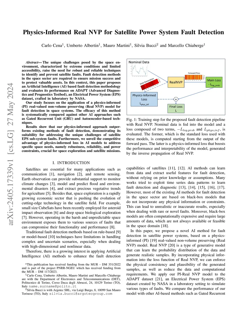 The unique challenges posed by the space environment, characterized by extreme conditions and limited accessibility, raise the need for robust and reliable techniques to identify and prevent satellite faults. Fault detection methods in the space sector are required to ensure mission success and to protect valuable assets. In this context, this paper proposes an Artificial Intelligence (AI) based fault detection methodology and evaluates its performance on ADAPT (Advanced Diagnostics and Prognostics Testbed), an Electrical Power System (EPS) dataset, crafted in laboratory by NASA. Our study focuses on the application of a physics-informed (PI) real-valued non-volume preserving (Real NVP) model for fault detection in space systems. The efficacy of this method is systematically compared against other AI approaches such as Gated Recurrent Unit (GRU) and Autoencoder-based techniques. Results show that our physics-informed approach outperforms existing methods of fault detection, demonstrating its suitability for addressing the unique challenges of satellite EPS sub-system faults. Furthermore, we unveil the competitive advantage of physics-informed loss in AI models to address specific space needs, namely robustness, reliability, and power constraints, crucial for space exploration and satellite missions.