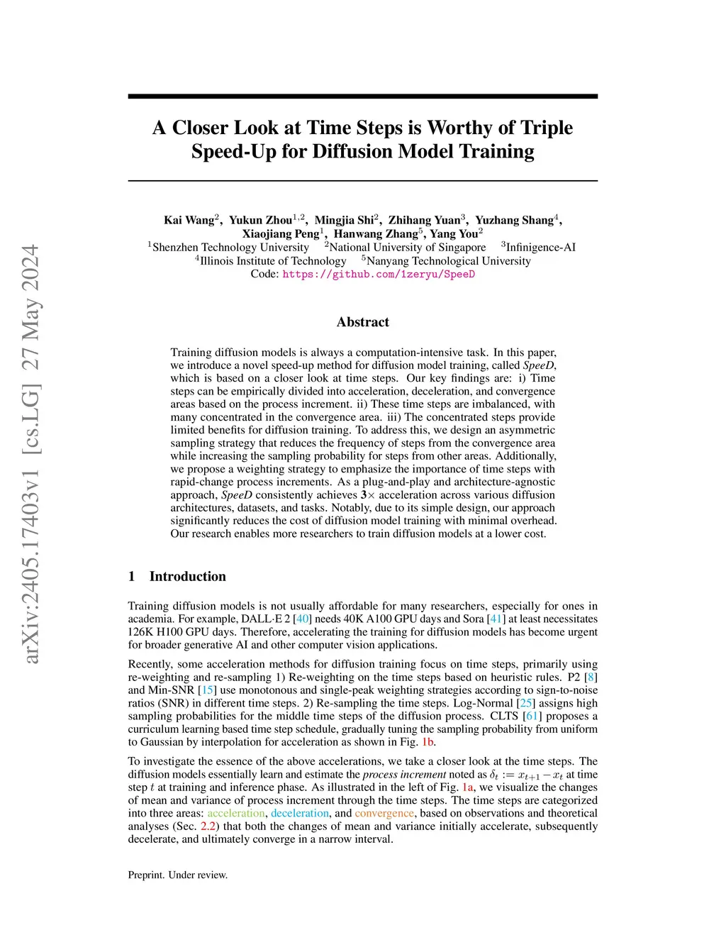 Training diffusion models is always a computation-intensive task. In this paper, we introduce a novel speed-up method for diffusion model training, called, which is based on a closer look at time steps. Our key findings are: i) Time steps can be empirically divided into acceleration, deceleration, and convergence areas based on the process increment. ii) These time steps are imbalanced, with many concentrated in the convergence area. iii) The concentrated steps provide limited benefits for diffusion training. To address this, we design an asymmetric sampling strategy that reduces the frequency of steps from the convergence area while increasing the sampling probability for steps from other areas. Additionally, we propose a weighting strategy to emphasize the importance of time steps with rapid-change process increments. As a plug-and-play and architecture-agnostic approach, SpeeD consistently achieves 3-times acceleration across various diffusion architectures, datasets, and tasks. Notably, due to its simple design, our approach significantly reduces the cost of diffusion model training with minimal overhead. Our research enables more researchers to train diffusion models at a lower cost.