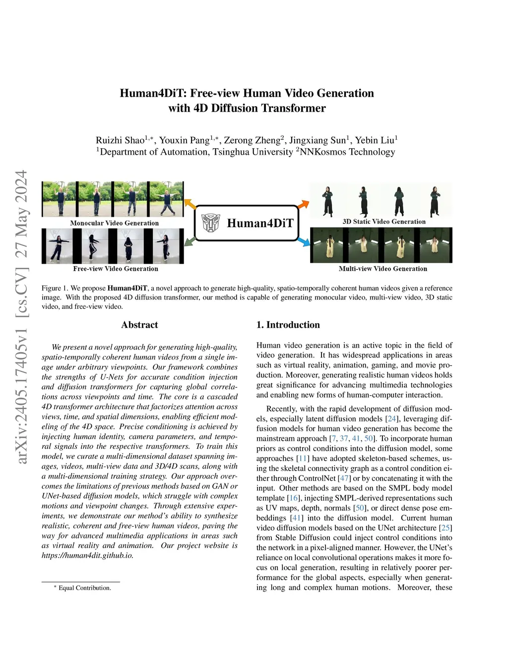We present a novel approach for generating high-quality, spatio-temporally coherent human videos from a single image under arbitrary viewpoints. Our framework combines the strengths of U-Nets for accurate condition injection and diffusion transformers for capturing global correlations across viewpoints and time. The core is a cascaded 4D transformer architecture that factorizes attention across views, time, and spatial dimensions, enabling efficient modeling of the 4D space. Precise conditioning is achieved by injecting human identity, camera parameters, and temporal signals into the respective transformers. To train this model, we curate a multi-dimensional dataset spanning images, videos, multi-view data and 3D/4D scans, along with a multi-dimensional training strategy. Our approach overcomes the limitations of previous methods based on GAN or UNet-based diffusion models, which struggle with complex motions and viewpoint changes. Through extensive experiments, we demonstrate our method's ability to synthesize realistic, coherent and free-view human videos, paving the way for advanced multimedia applications in areas such as virtual reality and animation. Our project website is https://human4dit.github.io.