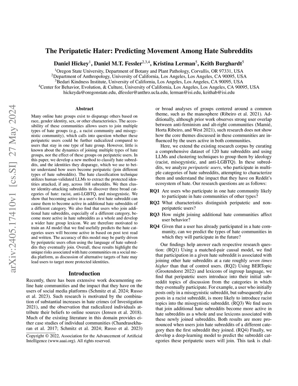 Many online hate groups exist to disparage others based on race, gender identity, sex, or other characteristics. The accessibility of these communities allows users to join multiple types of hate groups (e.g., a racist community and misogynistic community), which calls into question whether these peripatetic users could be further radicalized compared to users that stay in one type of hate group. However, little is known about the dynamics of joining multiple types of hate groups, nor the effect of these groups on peripatetic users. In this paper, we develop a new method to classify hate subreddits, and the identities they disparage, which we use to better understand how users become peripatetic (join different types of hate subreddits). The hate classification technique utilizes human-validated LLMs to extract the protected identities attacked, if any, across 168 subreddits. We then cluster identity-attacking subreddits to discover three broad categories of hate: racist, anti-LGBTQ, and misogynistic. We show that becoming active in a user's first hate subreddit can cause them to become active in additional hate subreddits of a different category. We also find that users who join additional hate subreddits, especially of a different category, become more active in hate subreddits as a whole and develop a wider hate group lexicon. We are therefore motivated to train an AI model that we find usefully predicts the hate categories users will become active in based on post text read and written. The accuracy of this model may be partly driven by peripatetic users often using the language of hate subreddits they eventually join. Overall, these results highlight the unique risks associated with hate communities on a social media platform, as discussion of alternative targets of hate may lead users to target more protected identities.