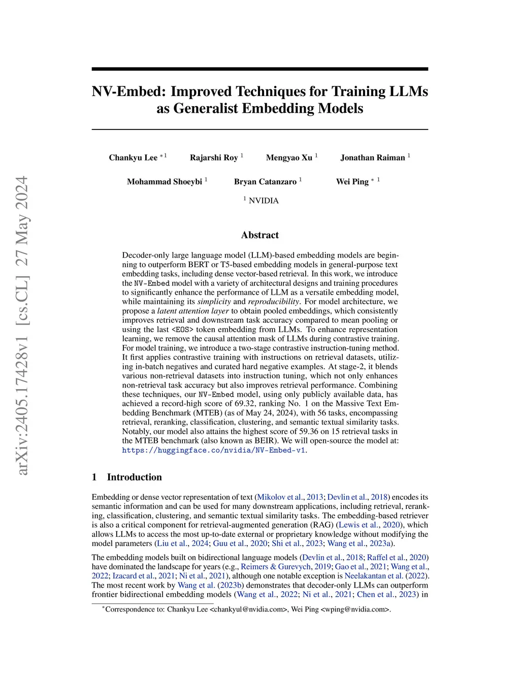 NV-Embed: Improved Techniques for Training LLMs as Generalist Embedding Models