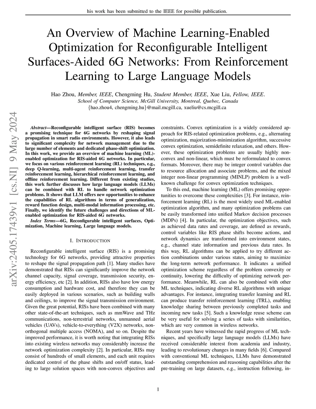 Reconfigurable intelligent surface (RIS) becomes a promising technique for 6G networks by reshaping signal propagation in smart radio environments. However, it also leads to significant complexity for network management due to the large number of elements and dedicated phase-shift optimization. In this work, we provide an overview of machine learning (ML)-enabled optimization for RIS-aided 6G networks. In particular, we focus on various reinforcement learning (RL) techniques, e.g., deep Q-learning, multi-agent reinforcement learning, transfer reinforcement learning, hierarchical reinforcement learning, and offline reinforcement learning. Different from existing studies, this work further discusses how large language models (LLMs) can be combined with RL to handle network optimization problems. It shows that LLM offers new opportunities to enhance the capabilities of RL algorithms in terms of generalization, reward function design, multi-modal information processing, etc. Finally, we identify the future challenges and directions of ML-enabled optimization for RIS-aided 6G networks.