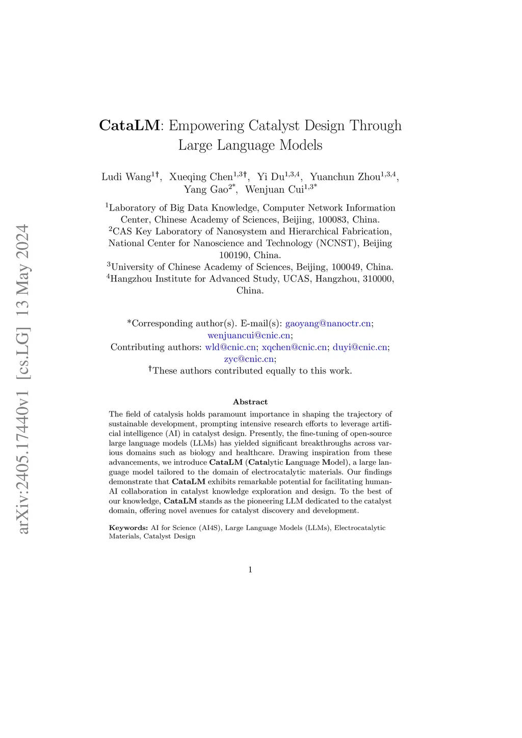 The field of catalysis holds paramount importance in shaping the trajectory of sustainable development, prompting intensive research efforts to leverage artificial intelligence (AI) in catalyst design. Presently, the fine-tuning of open-source large language models (LLMs) has yielded significant breakthroughs across various domains such as biology and healthcare. Drawing inspiration from these advancements, we introduce CataLM Cata}lytic Language Model), a large language model tailored to the domain of electrocatalytic materials. Our findings demonstrate that CataLM exhibits remarkable potential for facilitating human-AI collaboration in catalyst knowledge exploration and design. To the best of our knowledge, CataLM stands as the pioneering LLM dedicated to the catalyst domain, offering novel avenues for catalyst discovery and development.