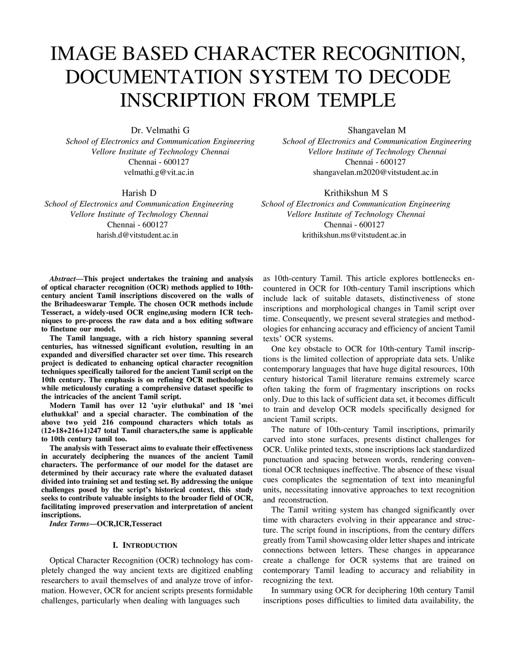 This project undertakes the training and analysis of optical character recognition OCR methods applied to 10th century ancient Tamil inscriptions discovered on the walls of the Brihadeeswarar Temple.The chosen OCR methods include Tesseract,a widely used OCR engine,using modern ICR techniques to pre process the raw data and a box editing software to finetune our model.The analysis with Tesseract aims to evaluate their effectiveness in accurately deciphering the nuances of the ancient Tamil characters.The performance of our model for the dataset are determined by their accuracy rate where the evaluated dataset divided into training set and testing set.By addressing the unique challenges posed by the script's historical context,this study seeks to contribute valuable insights to the broader field of OCR,facilitating improved preservation and interpretation of ancient inscriptions