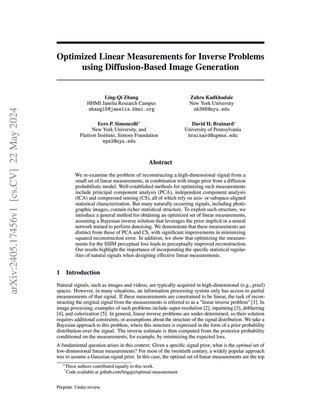 We examine the problem of selecting a small set of linear measurements for reconstructing high-dimensional signals. Well-established methods for optimizing such measurements include principal component analysis (PCA), independent component analysis (ICA) and compressed sensing (CS) based on random projections, all of which rely on axis- or subspace-aligned statistical characterization of the signal source. However, many naturally occurring signals, including photographic images, contain richer statistical structure. To exploit such structure, we introduce a general method for obtaining an optimized set of linear measurements for efficient image reconstruction, where the signal statistics are expressed by the prior implicit in a neural network trained to perform denoising (known as a "diffusion model"). We demonstrate that the optimal measurements derived for two natural image datasets differ from those of PCA, ICA, or CS, and result in substantially lower mean squared reconstruction error. Interestingly, the marginal distributions of the measurement values are asymmetrical (skewed), substantially more so than those of previous methods. We also find that optimizing with respect to perceptual loss, as quantified by structural similarity (SSIM), leads to measurements different from those obtained when optimizing for MSE. Our results highlight the importance of incorporating the specific statistical regularities of natural signals when designing effective linear measurements.