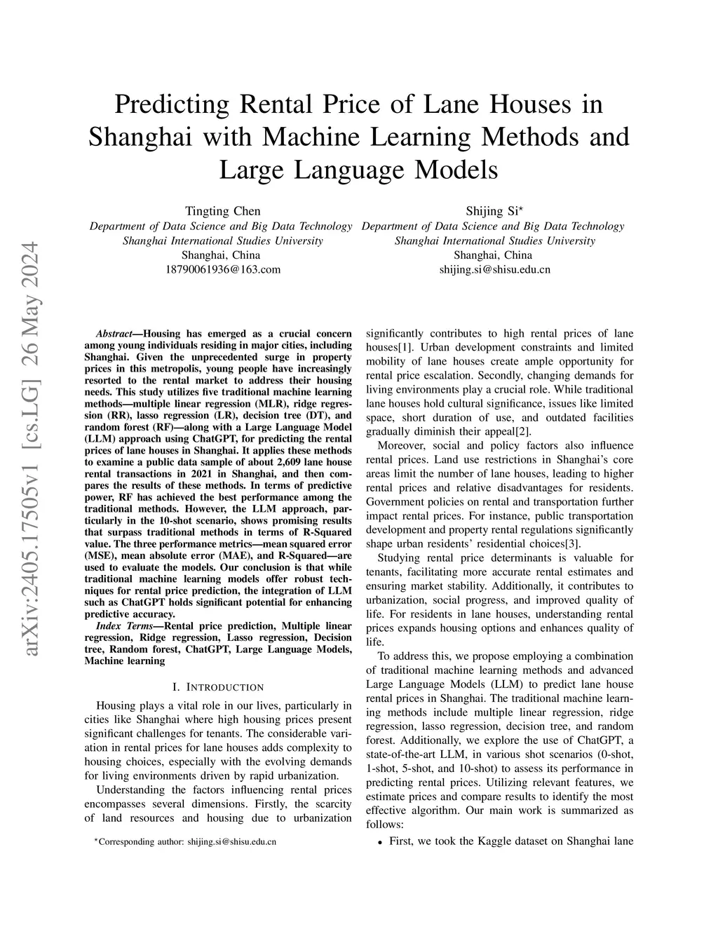 Housing has emerged as a crucial concern among young individuals residing in major cities, including Shanghai. Given the unprecedented surge in property prices in this metropolis, young people have increasingly resorted to the rental market to address their housing needs. This study utilizes five traditional machine learning methods: multiple linear regression (MLR), ridge regression (RR), lasso regression (LR), decision tree (DT), and random forest (RF), along with a Large Language Model (LLM) approach using ChatGPT, for predicting the rental prices of lane houses in Shanghai. It applies these methods to examine a public data sample of about 2,609 lane house rental transactions in 2021 in Shanghai, and then compares the results of these methods. In terms of predictive power, RF has achieved the best performance among the traditional methods. However, the LLM approach, particularly in the 10-shot scenario, shows promising results that surpass traditional methods in terms of R-Squared value. The three performance metrics: mean squared error (MSE), mean absolute error (MAE), and R-Squared, are used to evaluate the models. Our conclusion is that while traditional machine learning models offer robust techniques for rental price prediction, the integration of LLM such as ChatGPT holds significant potential for enhancing predictive accuracy.