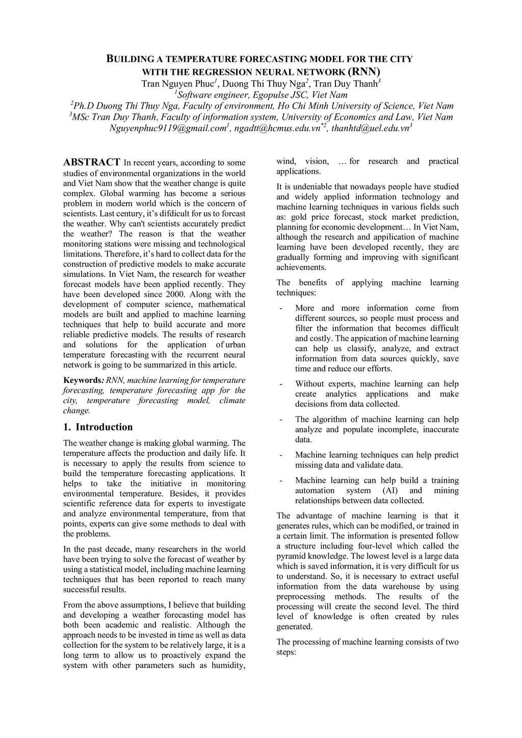 In recent years, a study by environmental organizations in the world and Vietnam shows that weather change is quite complex. global warming has become a serious problem in the modern world, which is a concern for scientists. last century, it was difficult to forecast the weather due to missing weather monitoring stations and technological limitations. this made it hard to collect data for building predictive models to make accurate simulations. in Vietnam, research on weather forecast models is a recent development, having only begun around 2000. along with advancements in computer science, mathematical models are being built and applied with machine learning techniques to create more accurate and reliable predictive models. this article will summarize the research and solutions for applying recurrent neural networks to forecast urban temperatures.
