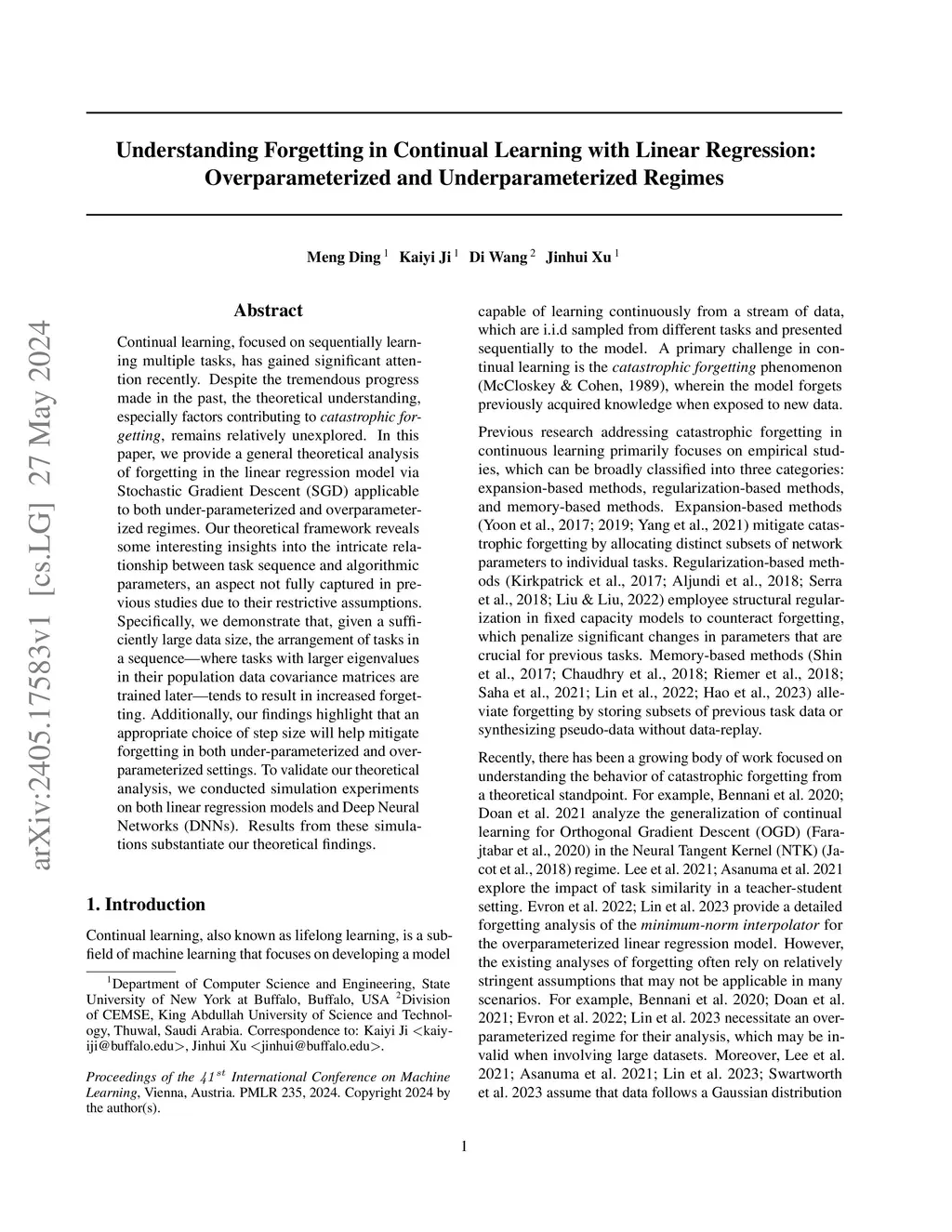 Continual learning, focused on sequentially learning multiple tasks, has gained significant attention recently. Despite the tremendous progress made in the past, the theoretical understanding, especially factors contributing to catastrophic forgetting, remains relatively unexplored. In this paper, we provide a general theoretical analysis of forgetting in the linear regression model via Stochastic Gradient Descent (SGD) applicable to both underparameterized and overparameterized regimes. Our theoretical framework reveals some interesting insights into the intricate relationship between task sequence and algorithmic parameters, an aspect not fully captured in previous studies due to their restrictive assumptions. Specifically, we demonstrate that, given a sufficiently large data size, the arrangement of tasks in a sequence, where tasks with larger eigenvalues in their population data covariance matrices are trained later, tends to result in increased forgetting. Additionally, our findings highlight that an appropriate choice of step size will help mitigate forgetting in both underparameterized and overparameterized settings. To validate our theoretical analysis, we conducted simulation experiments on both linear regression models and Deep Neural Networks (DNNs). Results from these simulations substantiate our theoretical findings.