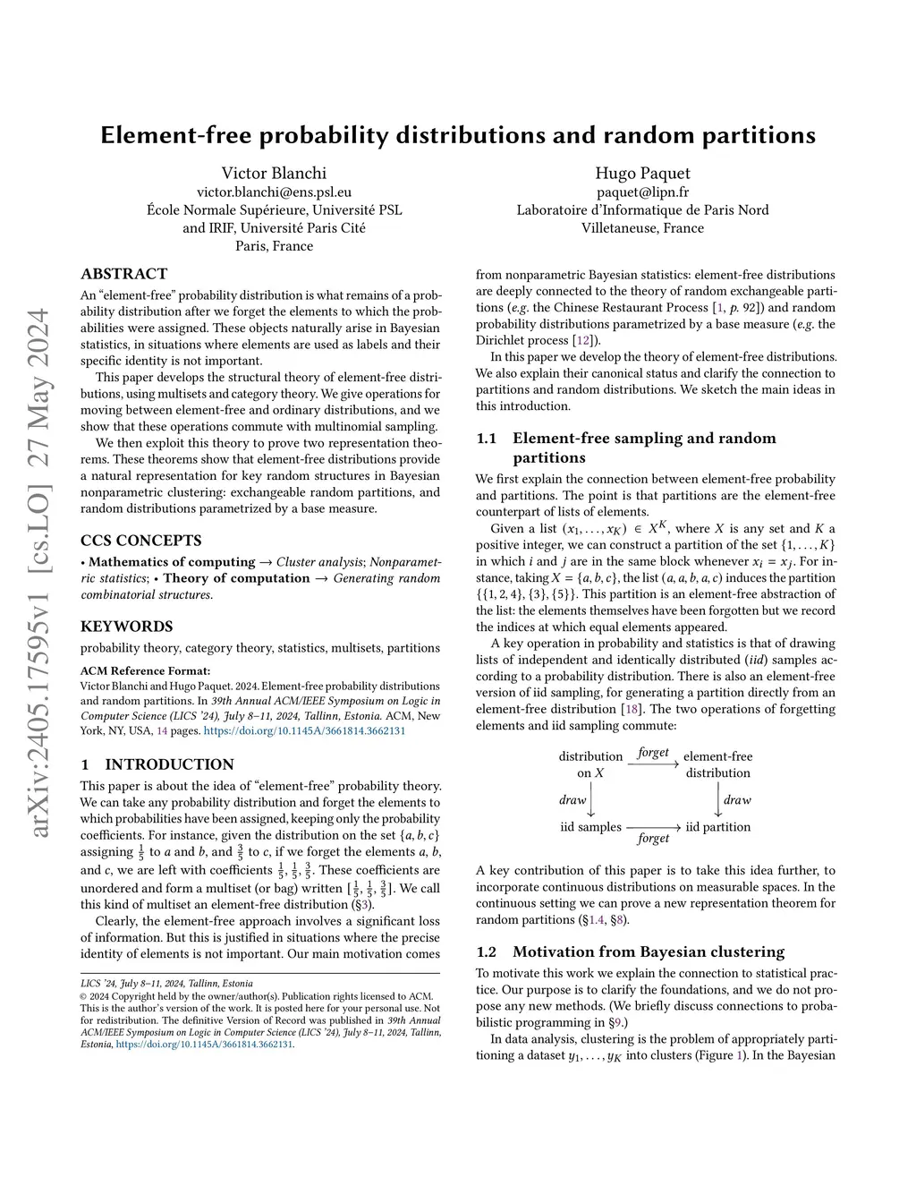 An "element-free" probability distribution is what remains of a probability distribution after we forget the elements to which the probabilities were assigned. These objects naturally arise in Bayesian statistics, in situations where elements are used as labels and their specific identity is not important. This paper develops the structural theory of element-free distributions, using multisets and category theory. We give operations for moving between element-free and ordinary distributions, and we show that these operations commute with multinomial sampling. We then exploit this theory to prove two representation theorems. These theorems show that element-free distributions provide a natural representation for key random structures in Bayesian nonparametric clustering: exchangeable random partitions, and random distributions parametrized by a base measure.
