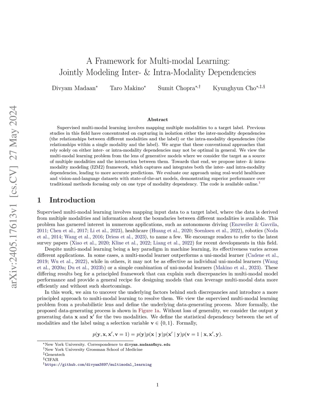 Supervised multi-modal learning involves mapping multiple modalities to a target label. Previous studies in this field have concentrated on capturing in isolation either the inter-modality dependencies (the relationships between different modalities and the label) or the intra-modality dependencies (the relationships within a single modality and the label). We argue that these conventional approaches that rely solely on either inter- or intra-modality dependencies may not be optimal in general. We view the multi-modal learning problem from the lens of generative models where we consider the target as a source of multiple modalities and the interaction between them. Towards that end, we propose inter- & intra-modality modeling (I2M2) framework, which captures and integrates both the inter- and intra-modality dependencies, leading to more accurate predictions. We evaluate our approach using real-world healthcare and vision-and-language datasets with state-of-the-art models, demonstrating superior performance over traditional methods focusing only on one type of modality dependency.