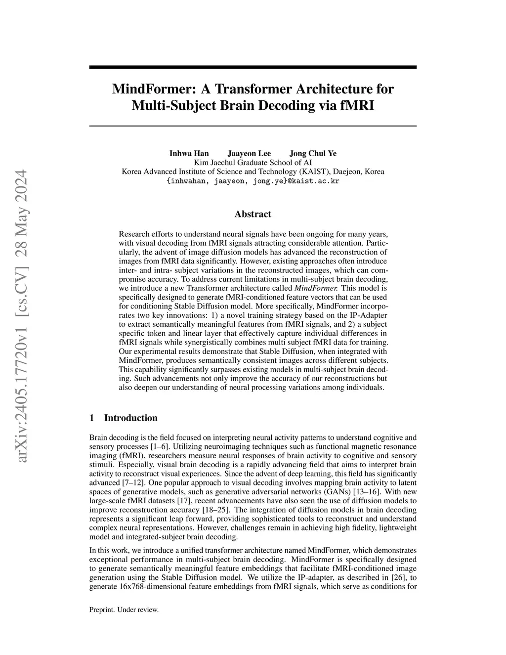 Research efforts to understand neural signals have been ongoing for many years, with visual decoding from fMRI signals attracting considerable attention. Particularly, the advent of image diffusion models has advanced the reconstruction of images from fMRI data significantly. However, existing approaches often introduce inter- and intra- subject variations in the reconstructed images, which can compromise accuracy. To address current limitations in multi-subject brain decoding, we introduce a new Transformer architecture called MindFormer. This model is specifically designed to generate fMRI-conditioned feature vectors that can be used for conditioning Stable Diffusion model. More specifically, MindFormer incorporates two key innovations: 1) a novel training strategy based on the IP-Adapter to extract semantically meaningful features from fMRI signals, and 2) a subject specific token and linear layer that effectively capture individual differences in fMRI signals while synergistically combines multi subject fMRI data for training. Our experimental results demonstrate that Stable Diffusion, when integrated with MindFormer, produces semantically consistent images across different subjects. This capability significantly surpasses existing models in multi-subject brain decoding. Such advancements not only improve the accuracy of our reconstructions but also deepen our understanding of neural processing variations among individuals.