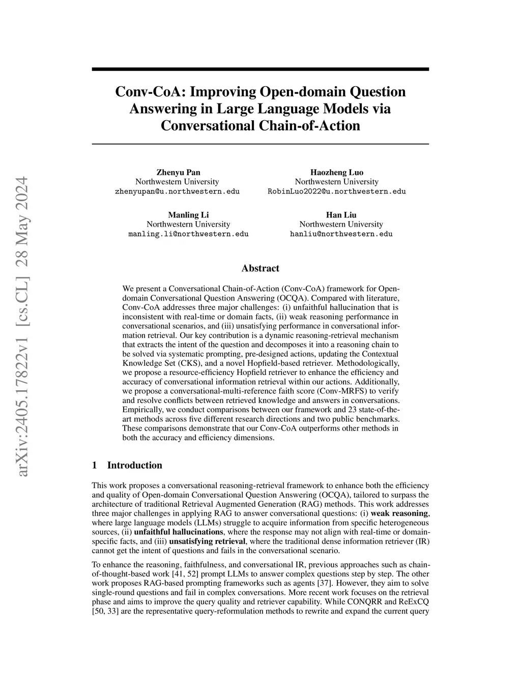 We present a Conversational Chain-of-Action (Conv-CoA) framework for Open-domain Conversational Question Answering (OCQA). Compared with literature, Conv-CoA addresses three major challenges: (i) unfaithful hallucination that is inconsistent with real-time or domain facts, (ii) weak reasoning performance in conversational scenarios, and (iii) unsatisfying performance in conversational information retrieval. Our key contribution is a dynamic reasoning-retrieval mechanism that extracts the intent of the question and decomposes it into a reasoning chain to be solved via systematic prompting, pre-designed actions, updating the Contextual Knowledge Set (CKS), and a novel Hopfield-based retriever. Methodologically, we propose a resource-efficiency Hopfield retriever to enhance the efficiency and accuracy of conversational information retrieval within our actions. Additionally, we propose a conversational-multi-reference faith score (Conv-MRFS) to verify and resolve conflicts between retrieved knowledge and answers in conversations. Empirically, we conduct comparisons between our framework and 23 state-of-the-art methods across five different research directions and two public benchmarks. These comparisons demonstrate that our Conv-CoA outperforms other methods in both the accuracy and efficiency dimensions.