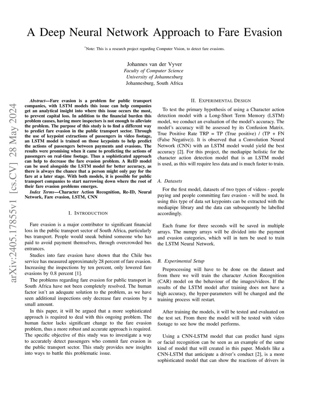 Fare evasion is a problem for public transport companies, with LSTM models this issue can help companies get an analytical insight into where this issue occurs the most, to prevent capital loss. In addition to the financial burden this problem causes, having more inspectors is not enough to alleviate the problem. The purpose of this study is to find a different way to predict fare evasion in the public transport sector. Through the use of keypoint extractions of passengers in video footage, an LSTM model is trained on those keypoints to help predict the actions of passengers between payments and evasions. The results were promising when it came to predicting the actions of passengers on real-time footage. Thus a sophisticated approach can help to decrease the fare evasion problem. A ReID model can be used alongside the LSTM model for better accuracy, as there is always the chance that a person might only pay for the fare at a later stage. With both models, it is possible for public transport companies to start narrowing down where the root of their fare evasion problems emerges.