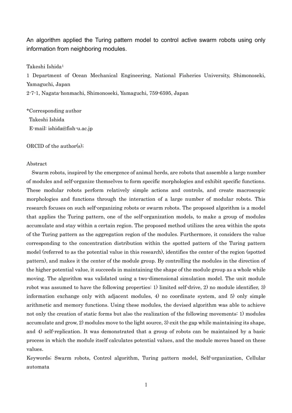 Swarm robots, inspired by the emergence of animal herds, are robots that assemble a large number of modules and self-organize themselves to form specific morphologies and exhibit specific functions. These modular robots perform relatively simple actions and controls, and create macroscopic morphologies and functions through the interaction of a large number of modular robots. This research focuses on such self-organizing robots or swarm robots. The proposed algorithm is a model that applies the Turing pattern, one of the self-organization models, to make a group of modules accumulate and stay within a certain region. The proposed method utilizes the area within the spots of the Turing pattern as the aggregation region of the modules. Furthermore, it considers the value corresponding to the concentration distribution within the spotted pattern of the Turing pattern model (referred to as the potential value in this research), identifies the center of the region (spotted pattern), and makes it the center of the module group. By controlling the modules in the direction of the higher potential value, it succeeds in maintaining the shape of the module group as a whole while moving. The algorithm was validated using a two-dimensional simulation model. The unit module robot was assumed to have the following properties: 1) limited self-drive, 2) no module identifier, 3) information exchange only with adjacent modules, 4) no coordinate system, and 5) only simple arithmetic and memory functions. Using these modules, the devised algorithm was able to achieve not only the creation of static forms but also the realization of the following movements: 1) modules accumulate and grow, 2) modules move to the light source, 3) exit the gap while maintaining its shape, and 4) self-replication.