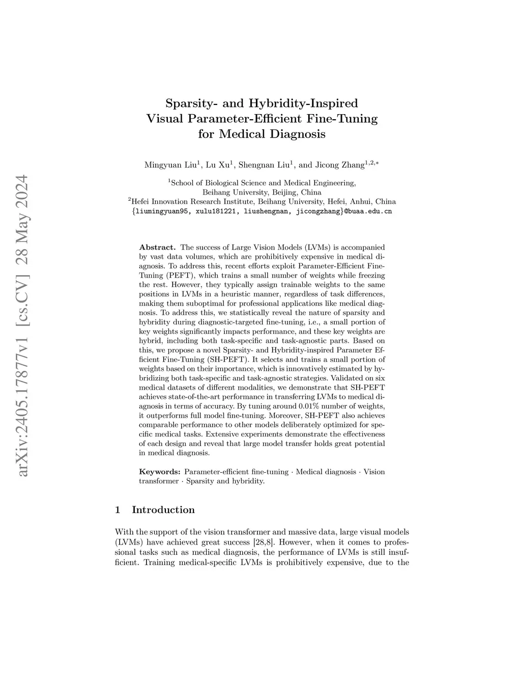 The success of Large Vision Models (LVMs) is accompanied by vast data volumes, which are prohibitively expensive in medical diagnosis.To address this, recent efforts exploit Parameter-Efficient Fine-Tuning (PEFT), which trains a small number of weights while freezing the rest.However, they typically assign trainable weights to the same positions in LVMs in a heuristic manner, regardless of task differences, making them suboptimal for professional applications like medical diagnosis.To address this, we statistically reveal the nature of sparsity and hybridity during diagnostic-targeted fine-tuning, i.e., a small portion of key weights significantly impacts performance, and these key weights are hybrid, including both task-specific and task-agnostic parts.Based on this, we propose a novel Sparsity- and Hybridity-inspired Parameter Efficient Fine-Tuning (SH-PEFT).It selects and trains a small portion of weights based on their importance, which is innovatively estimated by hybridizing both task-specific and task-agnostic strategies.Validated on six medical datasets of different modalities, we demonstrate that SH-PEFT achieves state-of-the-art performance in transferring LVMs to medical diagnosis in terms of accuracy. By tuning around 0.01% number of weights, it outperforms full model fine-tuning.Moreover, SH-PEFT also achieves comparable performance to other models deliberately optimized for specific medical tasks.Extensive experiments demonstrate the effectiveness of each design and reveal that large model transfer holds great potential in medical diagnosis.
