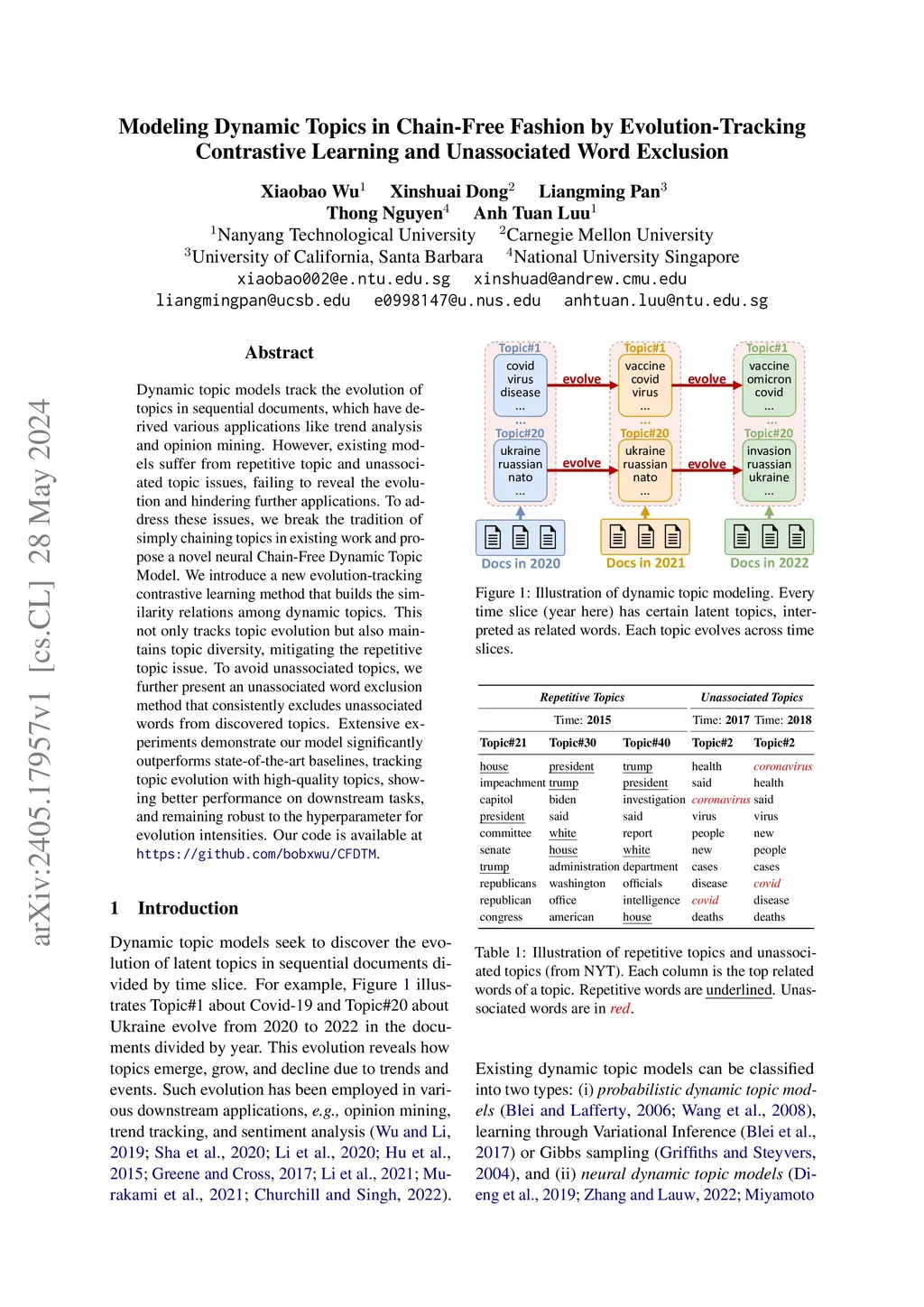 Modeling Dynamic Topics in Chain-Free Fashion by Evolution-Tracking
