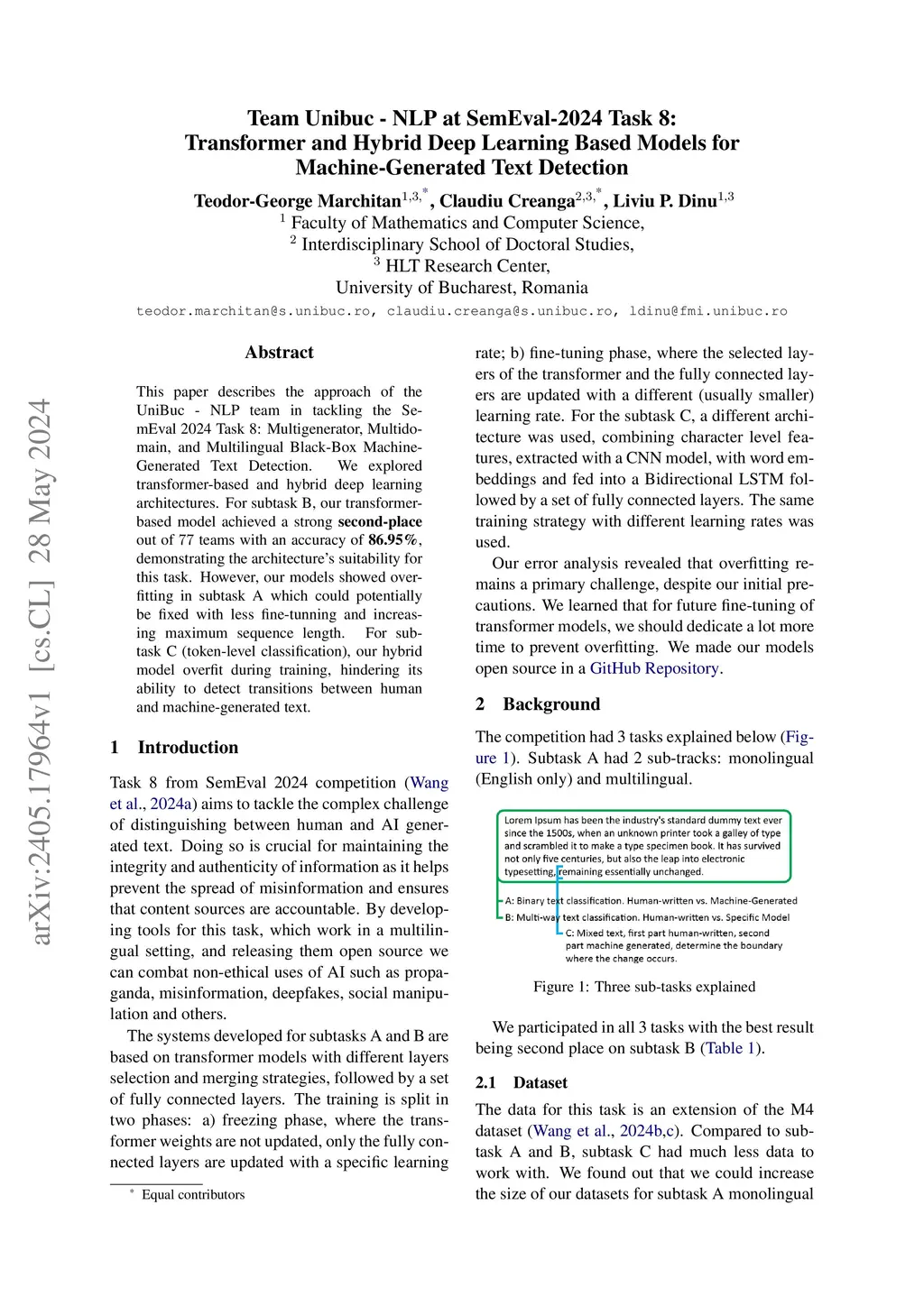 This paper describes the approach of the UniBuc - NLP team in tackling the SemEval 2024 Task 8: Multigenerator, Multidomain, and Multilingual Black-Box Machine-Generated Text Detection. We explored transformer-based and hybrid deep learning architectures. For subtask B, our transformer-based model achieved a strong \textbf{second-place} out of teams with an accuracy of \textbf{86.95\%}, demonstrating the architecture's suitability for this task. However, our models showed overfitting in subtask A which could potentially be fixed with less fine-tunning and increasing maximum sequence length. For subtask C (token-level classification), our hybrid model overfit during training, hindering its ability to detect transitions between human and machine-generated text.