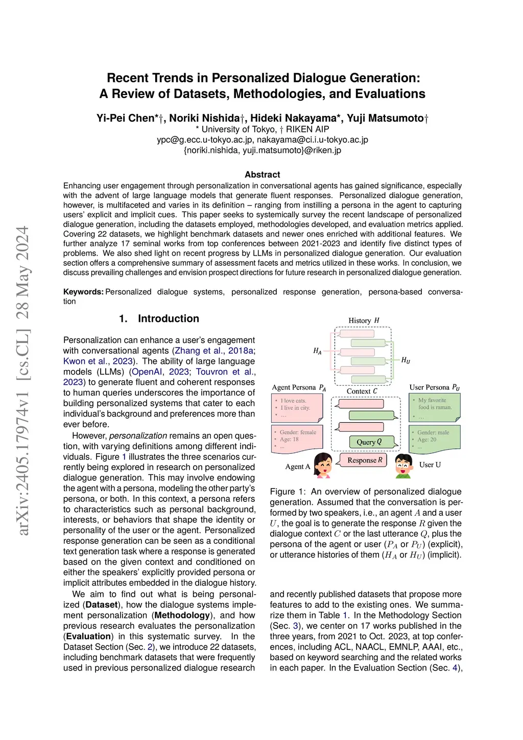 Enhancing user engagement through personalization in conversational agents has gained significance, especially with the advent of large language models that generate fluent responses. Personalized dialogue generation, however, is multifaceted and varies in its definition -- ranging from instilling a persona in the agent to capturing users' explicit and implicit cues. This paper seeks to systemically survey the recent landscape of personalized dialogue generation, including the datasets employed, methodologies developed, and evaluation metrics applied. Covering 22 datasets, we highlight benchmark datasets and newer ones enriched with additional features. We further analyze 17 seminal works from top conferences between 2021-2023 and identify five distinct types of problems. We also shed light on recent progress by LLMs in personalized dialogue generation. Our evaluation section offers a comprehensive summary of assessment facets and metrics utilized in these works. In conclusion, we discuss prevailing challenges and envision prospect directions for future research in personalized dialogue generation.