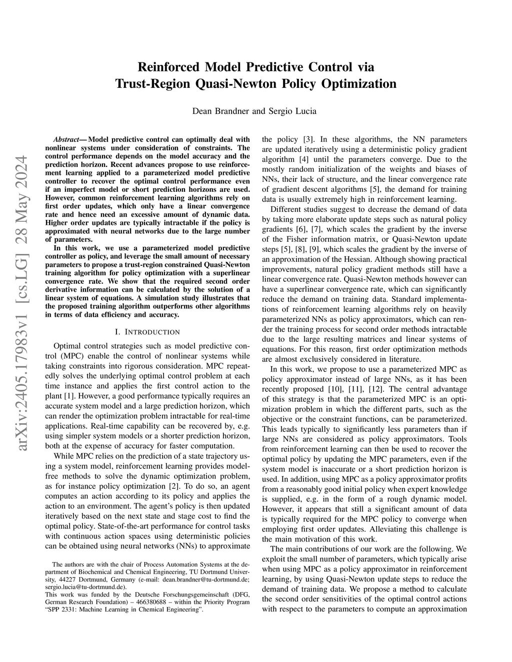 Model predictive control can optimally deal with nonlinear systems under consideration of constraints. The control performance depends on the model accuracy and the prediction horizon. Recent advances propose to use reinforcement learning applied to a parameterized model predictive controller to recover the optimal control performance even if an imperfect model or short prediction horizons are used. However, common reinforcement learning algorithms rely on first order updates, which only have a linear convergence rate and hence need an excessive amount of dynamic data. Higher order updates are typically intractable if the policy is approximated with neural networks due to the large number of parameters. In this work, we use a parameterized model predictive controller as policy, and leverage the small amount of necessary parameters to propose a trust-region constrained Quasi-Newton training algorithm for policy optimization with a superlinear convergence rate. We show that the required second order derivative information can be calculated by the solution of a linear system of equations. A simulation study illustrates that the proposed training algorithm outperforms other algorithms in terms of data efficiency and accuracy.
