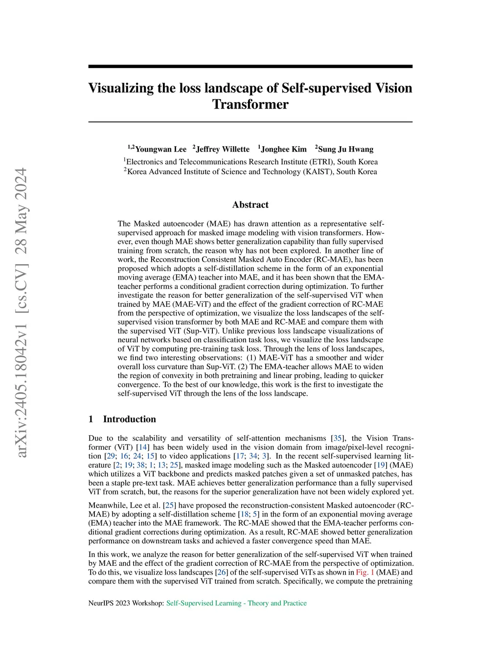 The Masked autoencoder (MAE) has drawn attention as a representative self-supervised approach for masked image modeling with vision transformers. However, even though MAE shows better generalization capability than fully supervised training from scratch, the reason why has not been explored. In another line of work, the Reconstruction Consistent Masked Auto Encoder (RC-MAE), has been proposed which adopts a self-distillation scheme in the form of an exponential moving average (EMA) teacher into MAE, and it has been shown that the EMA-teacher performs a conditional gradient correction during optimization. To further investigate the reason for better generalization of the self-supervised ViT when trained by MAE (MAE-ViT) and the effect of the gradient correction of RC-MAE from the perspective of optimization, we visualize the loss landscapes of the self-supervised vision transformer by both MAE and RC-MAE and compare them with the supervised ViT (Sup-ViT). Unlike previous loss landscape visualizations of neural networks based on classification task loss, we visualize the loss landscape of ViT by computing pre-training task loss. Through the lens of loss landscapes, we find two interesting observations: (1) MAE-ViT has a smoother and wider overall loss curvature than Sup-ViT. (2) The EMA-teacher allows MAE to widen the region of convexity in both pretraining and linear probing, leading to quicker convergence. To the best of our knowledge, this work is the first to investigate the self-supervised ViT through the lens of the loss landscape.