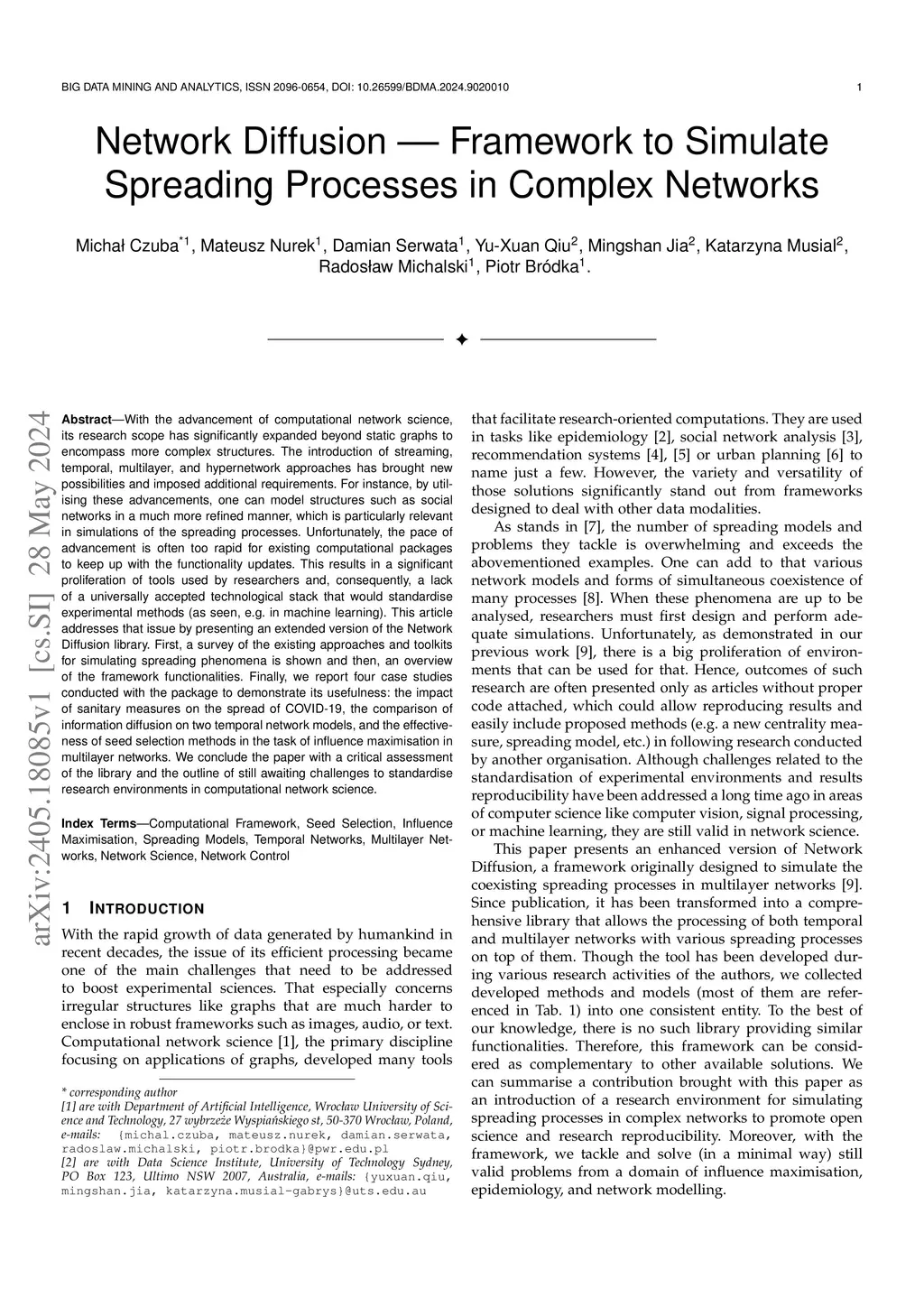 With the advancement of computational network science, its research scope has significantly expanded beyond static graphs to encompass more complex structures. The introduction of streaming, temporal, multilayer, and hypernetwork approaches has brought new possibilities and imposed additional requirements. For instance, by utilising these advancements, one can model structures such as social networks in a much more refined manner, which is particularly relevant in simulations of the spreading processes. Unfortunately, the pace of advancement is often too rapid for existing computational packages to keep up with the functionality updates. This results in a significant proliferation of tools used by researchers and, consequently, a lack of a universally accepted technological stack that would standardise experimental methods (as seen, e.g. in machine learning). This article addresses that issue by presenting an extended version of the Network Diffusion library. First, a survey of the existing approaches and toolkits for simulating spreading phenomena is shown and then, an overview of the framework functionalities. Finally, we report four case studies conducted with the package to demonstrate its usefulness: the impact of sanitary measures on the spread of COVID-19, the comparison of information diffusion on two temporal network models, and the effectiveness of seed selection methods in the task of influence maximisation in multilayer networks. We conclude the paper with a critical assessment of the library and the outline of still awaiting challenges to standardise research environments in computational network science.