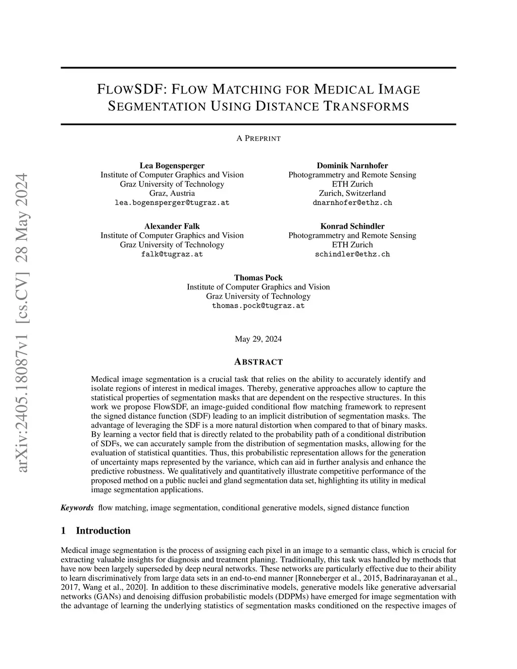 Medical image segmentation plays an important role in accurately identifying and isolating regions of interest within medical images. Generative approaches are particularly effective in modeling the statistical properties of segmentation masks that are closely related to the respective structures. In this work we introduce FlowSDF, an image-guided conditional flow matching framework, designed to represent the signed distance function (SDF), and, in turn, to represent an implicit distribution of segmentation masks. The advantage of leveraging the SDF is a more natural distortion when compared to that of binary masks. Through the learning of a vector field associated with the probability path of conditional SDF distributions, our framework enables accurate sampling of segmentation masks and the computation of relevant statistical measures. This probabilistic approach also facilitates the generation of uncertainty maps represented by the variance, thereby supporting enhanced robustness in prediction and further analysis. We qualitatively and quantitatively illustrate competitive performance of the proposed method on a public nuclei and gland segmentation data set, highlighting its utility in medical image segmentation applications.