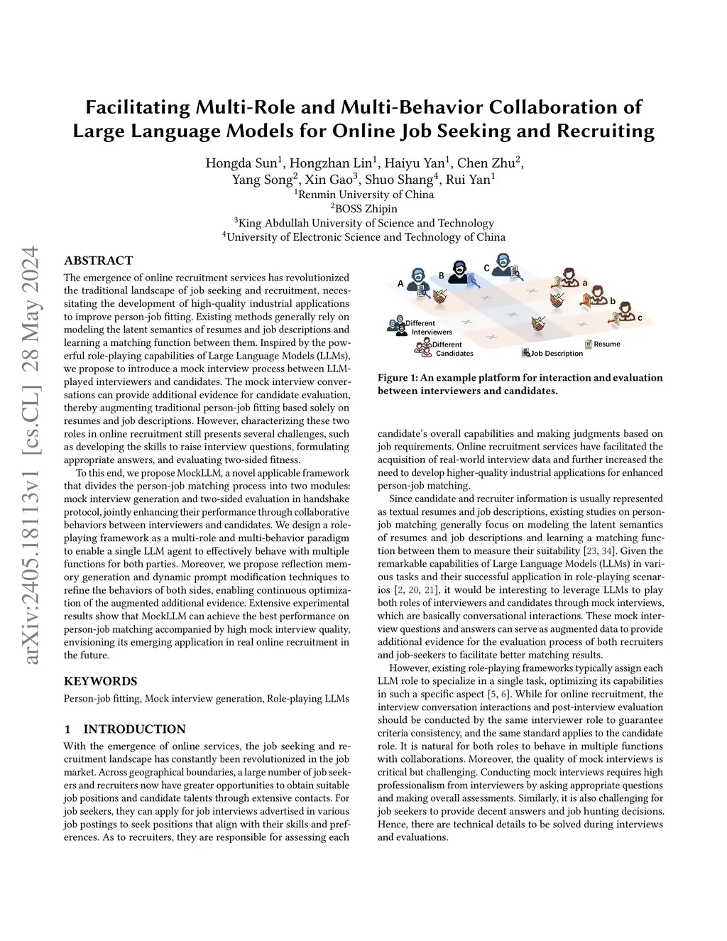 Online recruitment platforms have reshaped job-seeking and recruiting processes, driving increased demand for applications that enhance person-job matching. Traditional methods generally rely on analyzing textual data from resumes and job descriptions, limiting the dynamic, interactive aspects crucial to effective recruitment. Recent advances in Large Language Models (LLMs) have revealed remarkable potential in simulating adaptive, role-based dialogues, making them well-suited for recruitment scenarios. In this paper, we propose \textbf{MockLLM}, a novel framework to generate and evaluate mock interview interactions. The system consists of two key components: mock interview generation and two-sided evaluation in handshake protocol. By simulating both interviewer and candidate roles, MockLLM enables consistent and collaborative interactions for real-time and two-sided matching. To further improve the matching quality, MockLLM further incorporates reflection memory generation and dynamic strategy modification, refining behaviors based on previous experience. We evaluate MockLLM on real-world data Boss Zhipin, a major Chinese recruitment platform. The experimental results indicate that MockLLM outperforms existing methods in matching accuracy, scalability, and adaptability across job domains, highlighting its potential to advance candidate assessment and online recruitment.
