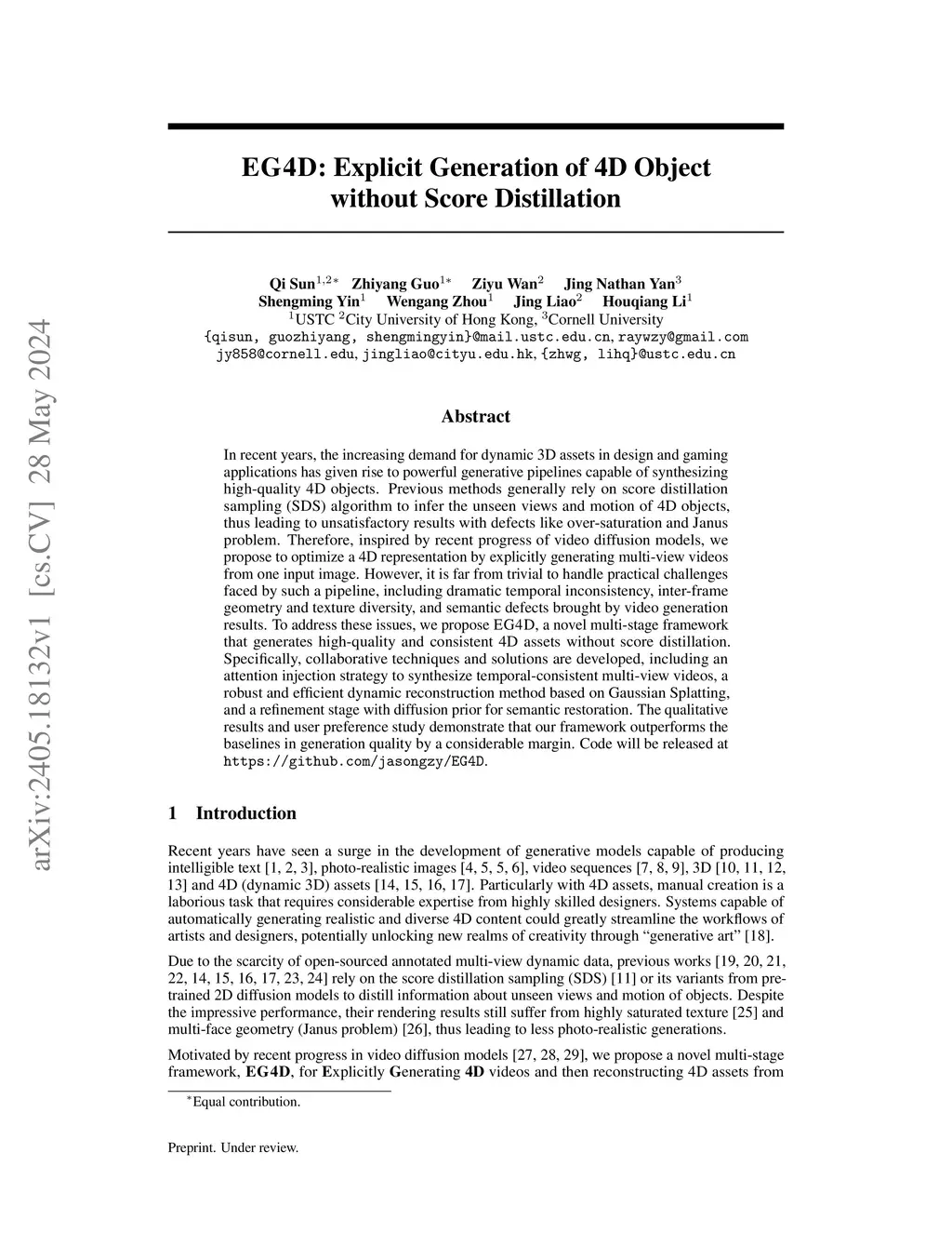 EG4D: Explicit Generation of 4D Object without Score Distillation