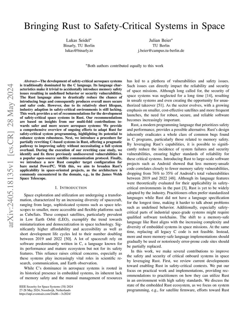 The development of safety-critical aerospace systems is traditionally dominated by the C language. Its language characteristics make it trivial to accidentally introduce memory safety issues resulting in undefined behavior or security vulnerabilities. The Rust language aims to drastically reduce the chance of introducing bugs and consequently produces overall more secure and safer code. However, due to its relatively short lifespan, industry adaption in safety-critical environments is still lacking. This work provides a set of recommendations for the development of safety-critical space systems in Rust. Our recommendations are based on insights from our multi-fold contributions towards safer and more secure aerospace systems: We provide a comprehensive overview of ongoing efforts to adapt Rust for safety-critical system programming, highlighting its potential to enhance system robustness. Next, we introduce a procedure for partially rewriting C-based systems in Rust, offering a pragmatic pathway to improving safety without necessitating a full system overhaul. During the execution of our rewriting case study, we identify and fix three previously undiscovered vulnerabilities in a popular open-source satellite communication protocol. Finally, we introduce a new Rust compiler target configuration for bare metal PowerPC. With this, we aim to broaden Rust's applicability in space-oriented projects, as the architecture is commonly encountered in the domain, e.g., in the James Webb Space Telescope.