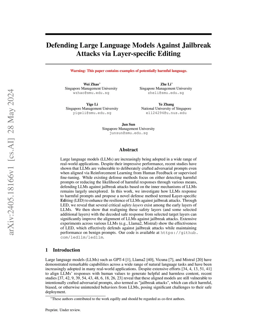 Large language models (LLMs) are increasingly being adopted in a wide range of real-world applications. Despite their impressive performance, recent studies have shown that LLMs are vulnerable to deliberately crafted adversarial prompts even when aligned via Reinforcement Learning from Human Feedback or supervised fine-tuning. While existing defense methods focus on either detecting harmful prompts or reducing the likelihood of harmful responses through various means, defending LLMs against jailbreak attacks based on the inner mechanisms of LLMs remains largely unexplored. In this work, we investigate how LLMs response to harmful prompts and propose a novel defense method termed \textbf{L}ayer-specific \textbf{Ed}iting (LED) to enhance the resilience of LLMs against jailbreak attacks. Through LED, we reveal that several critical \textit{safety layers} exist among the early layers of LLMs. We then show that realigning these safety layers (and some selected additional layers) with the decoded safe response from selected target layers can significantly improve the alignment of LLMs against jailbreak attacks. Extensive experiments across various LLMs (e.g., Llama2, Mistral) show the effectiveness of LED, which effectively defends against jailbreak attacks while maintaining performance on benign prompts. Our code is available at \url{https://github.com/ledllm/ledllm}.