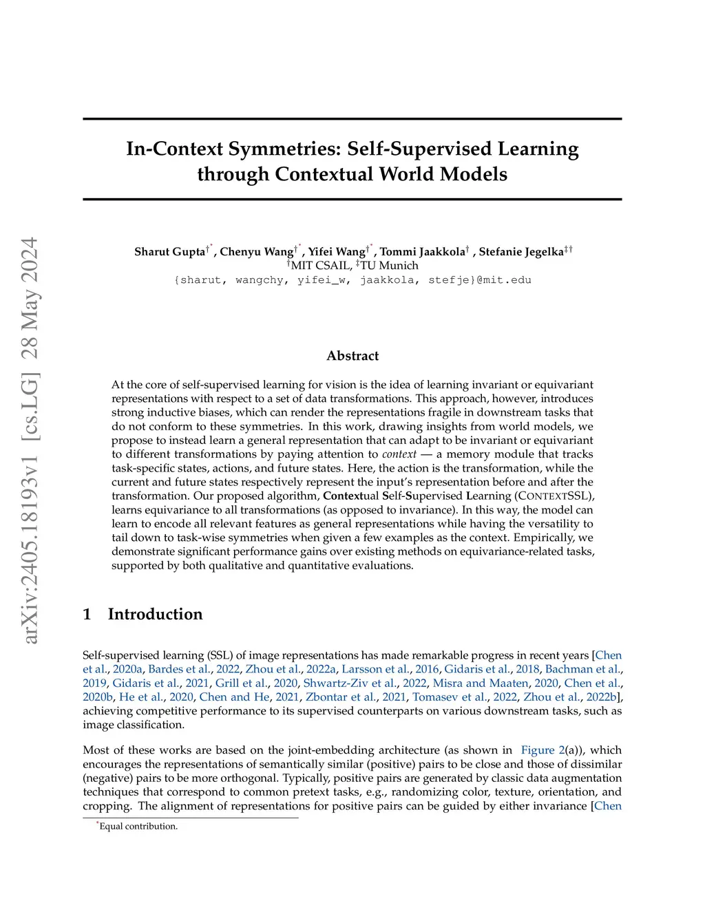 At the core of self-supervised learning for vision is the idea of learning invariant or equivariant representations with respect to a set of data transformations. This approach, however, introduces strong inductive biases, which can render the representations fragile in downstream tasks that do not conform to these symmetries. In this work, drawing insights from world models, we propose to instead learn a general representation that can adapt to be invariant or equivariant to different transformations by paying attention to context -- a memory module that tracks task-specific states, actions, and future states. Here, the action is the transformation, while the current and future states respectively represent the input's representation before and after the transformation. Our proposed algorithm, Contextual Self-Supervised Learning (ContextSSL), learns equivariance to all transformations (as opposed to invariance). In this way, the model can learn to encode all relevant features as general representations while having the versatility to tail down to task-wise symmetries when given a few examples as the context. Empirically, we demonstrate significant performance gains over existing methods on equivariance-related tasks, supported by both qualitative and quantitative evaluations.