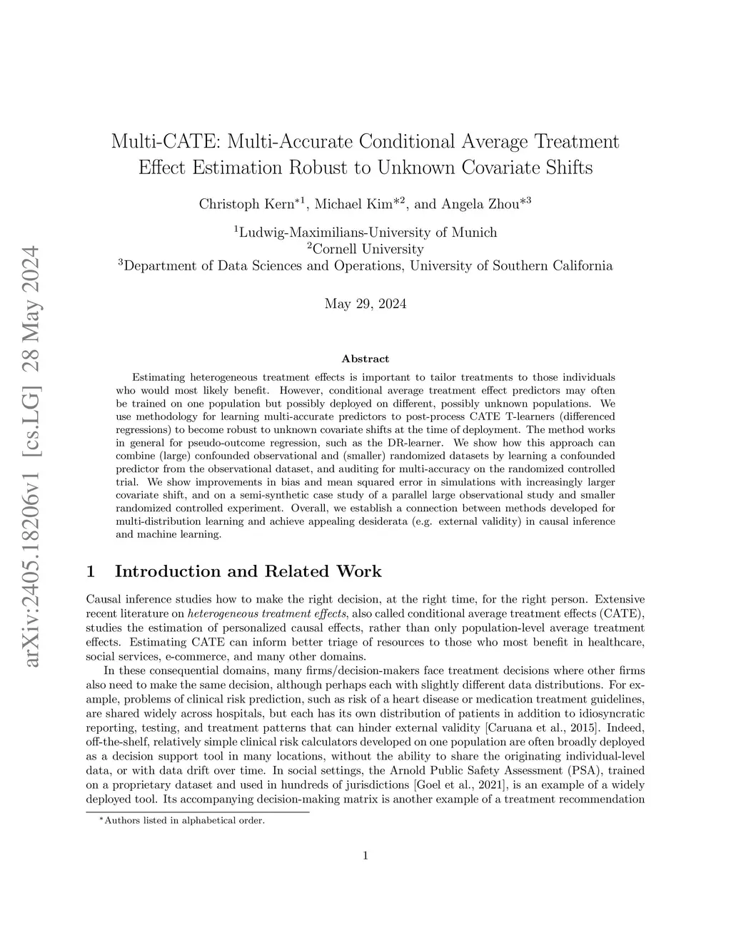 Estimating heterogeneous treatment effects is important to tailor treatments to those individuals who would most likely benefit. However, conditional average treatment effect predictors may often be trained on one population but possibly deployed on different, possibly unknown populations. We use methodology for learning multi-accurate predictors to post-process CATE T-learners (differenced regressions) to become robust to unknown covariate shifts at the time of deployment. The method works in general for pseudo-outcome regression, such as the DR-learner. We show how this approach can combine (large) confounded observational and (smaller) randomized datasets by learning a confounded predictor from the observational dataset, and auditing for multi-accuracy on the randomized controlled trial. We show improvements in bias and mean squared error in simulations with increasingly larger covariate shift, and on a semi-synthetic case study of a parallel large observational study and smaller randomized controlled experiment. Overall, we establish a connection between methods developed for multi-distribution learning and achieve appealing desiderata (e.g. external validity) in causal inference and machine learning.