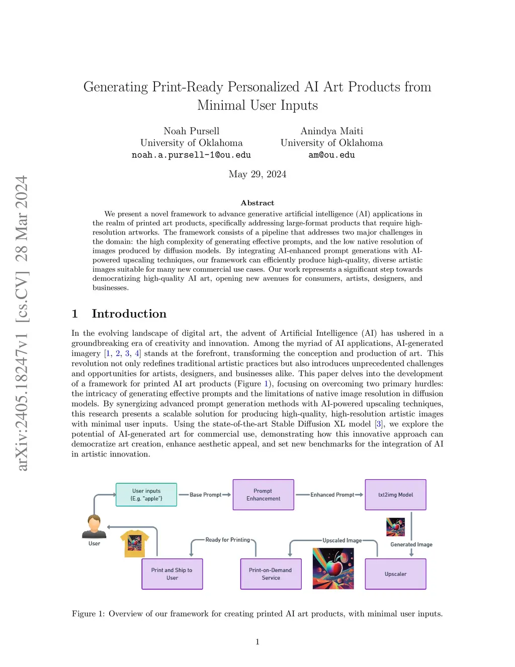 We present a novel framework to advance generative artificial intelligence (AI) applications in the realm of printed art products, specifically addressing large-format products that require high-resolution artworks. The framework consists of a pipeline that addresses two major challenges in the domain: the high complexity of generating effective prompts, and the low native resolution of images produced by diffusion models. By integrating AI-enhanced prompt generations with AI-powered upscaling techniques, our framework can efficiently produce high-quality, diverse artistic images suitable for many new commercial use cases. Our work represents a significant step towards democratizing high-quality AI art, opening new avenues for consumers, artists, designers, and businesses.