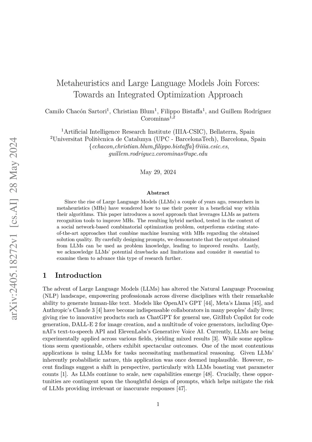 Metaheuristics and Large Language Models Join Forces: Toward an Integrated Optimization Approach