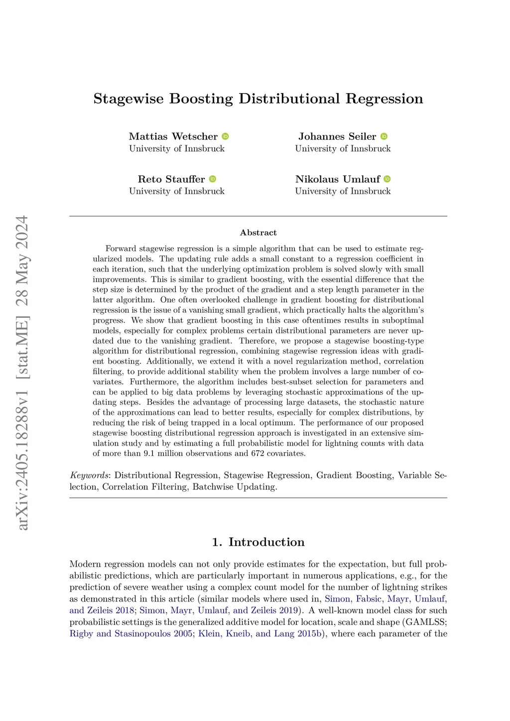Forward stagewise regression is a simple algorithm that can be used to estimate regularized models. The updating rule adds a small constant to a regression coefficient in each iteration, such that the underlying optimization problem is solved slowly with small improvements. This is similar to gradient boosting, with the essential difference that the step size is determined by the product of the gradient and a step length parameter in the latter algorithm. One often overlooked challenge in gradient boosting for distributional regression is the issue of a vanishing small gradient, which practically halts the algorithm's progress. We show that gradient boosting in this case oftentimes results in suboptimal models, especially for complex problems certain distributional parameters are never updated due to the vanishing gradient. Therefore, we propose a stagewise boosting-type algorithm for distributional regression, combining stagewise regression ideas with gradient boosting. Additionally, we extend it with a novel regularization method, correlation filtering, to provide additional stability when the problem involves a large number of covariates. Furthermore, the algorithm includes best-subset selection for parameters and can be applied to big data problems by leveraging stochastic approximations of the updating steps. Besides the advantage of processing large datasets, the stochastic nature of the approximations can lead to better results, especially for complex distributions, by reducing the risk of being trapped in a local optimum. The performance of our proposed stagewise boosting distributional regression approach is investigated in an extensive simulation study and by estimating a full probabilistic model for lightning counts with data of more than 9.1 million observations and 672 covariates.