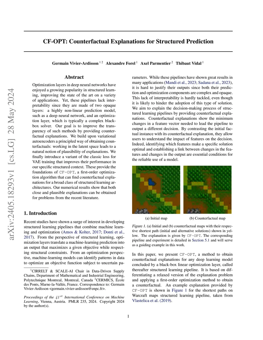Optimization layers in deep neural networks have enjoyed a growing popularity in structured learning, improving the state of the art on a variety of applications. Yet, these pipelines lack interpretability since they are made of two opaque layers: a highly non-linear prediction model, such as a deep neural network, and an optimization layer, which is typically a complex black-box solver. Our goal is to improve the transparency of such methods by providing counterfactual explanations. We build upon variational autoencoders a principled way of obtaining counterfactuals: working in the latent space leads to a natural notion of plausibility of explanations. We finally introduce a variant of the classic loss for VAE training that improves their performance in our specific structured context. These provide the foundations of CF-OPT, a first-order optimization algorithm that can find counterfactual explanations for a broad class of structured learning architectures. Our numerical results show that both close and plausible explanations can be obtained for problems from the recent literature.